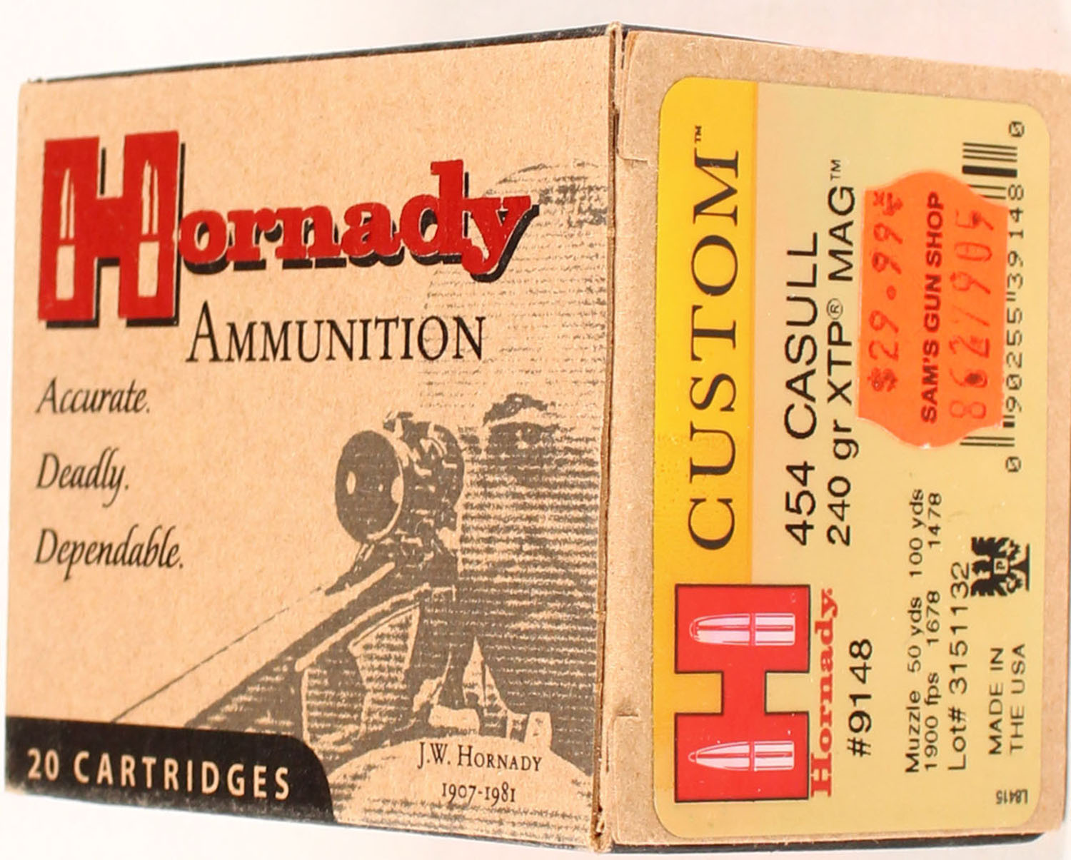 Hornady, 454 Casull, 240 Grain XTP Mag, Full, 1pc. multi-colored box, box is solid with excellent color, Ammo is excellent. Grade: Excellent ++ - Value: 20 to 80