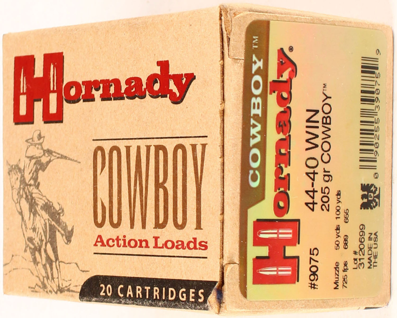 Hornady, 44-40 Win, 205 Grain Cowboy, Partial 18rds, 1pc. multi-colored box, box is solid with excellent color, Ammo is excellent. Grade: Excellent ++ - Value: 20 to 80