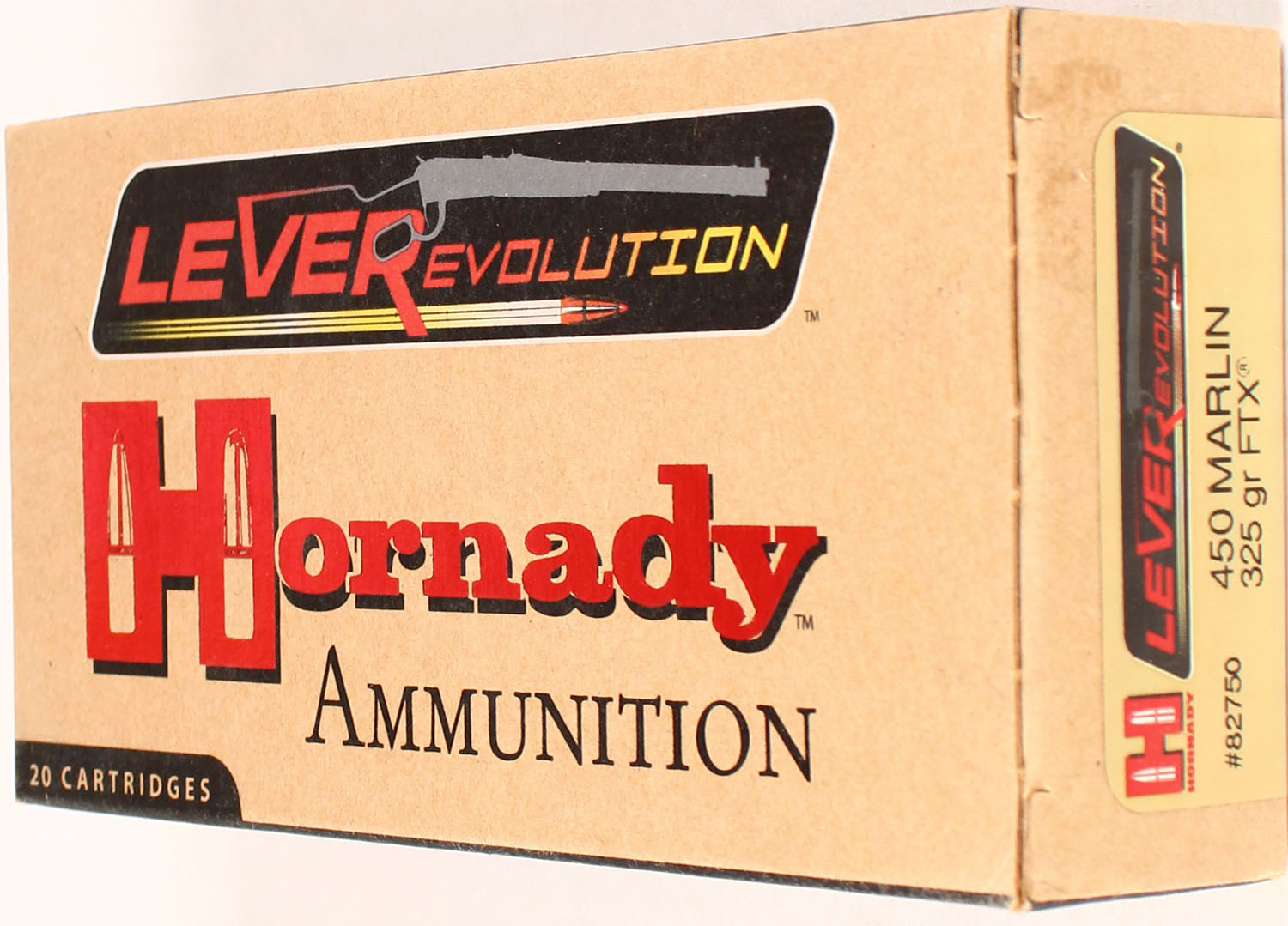 Hornady, LeveRevolution, 450 Marlin, 325 Grain FTX, Full, 1pc. multi-colored box, box is solid with excellent color, Ammo is excellent. Grade: Excellent ++ - Value: 20 to 80