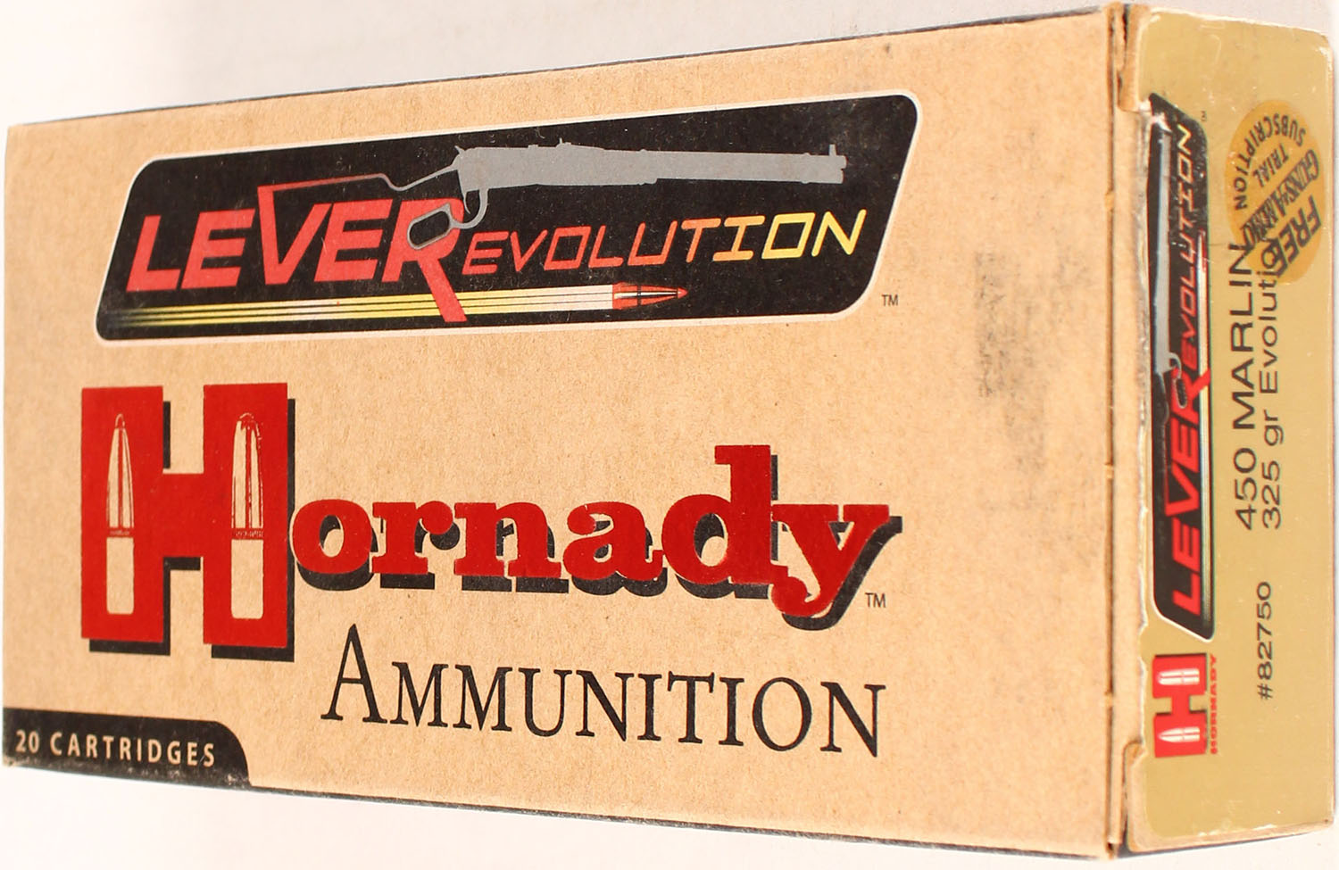 Hornady, LeveRevolution, 450 Marlin, 325 Grain Evolution, Full, 1pc. multi-colored box, box is solid with excellent color, Ammo is excellent. Grade: Excellent ++ - Value: 20 to 80