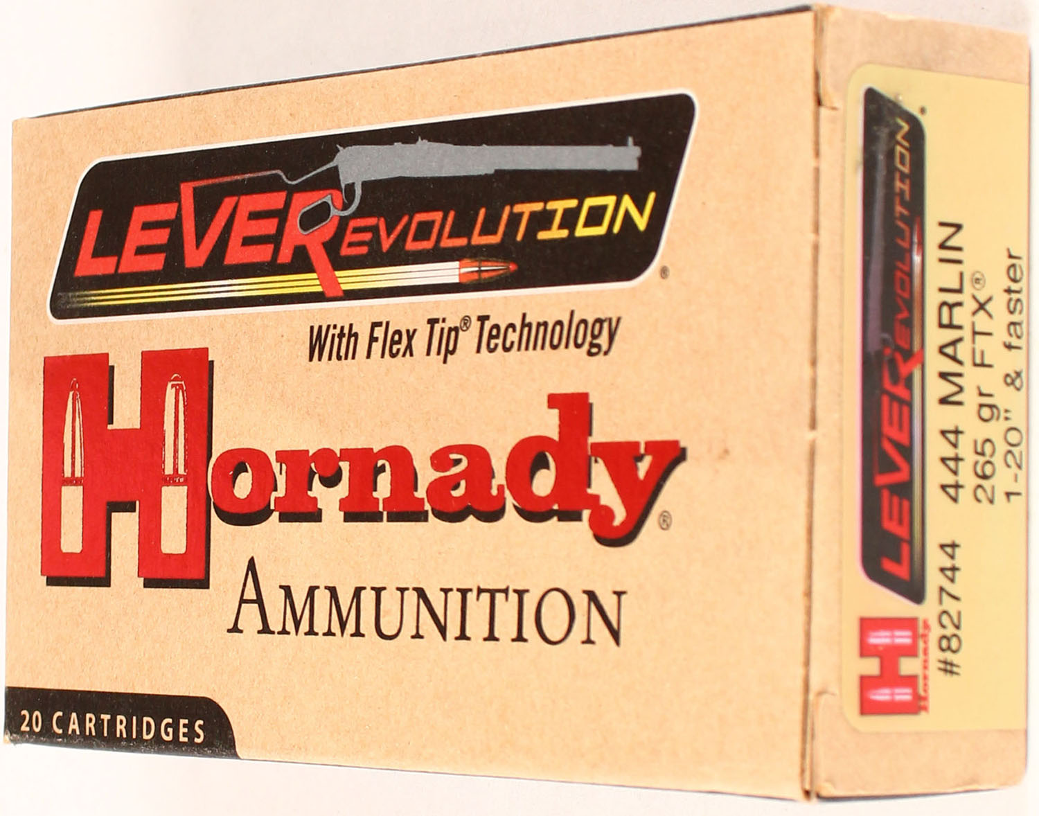 Hornady, LeveRevolution, 444 Marlin, 265 Grain FTX, Full, 1pc. multi-colored box, box is solid with excellent color, Ammo is excellent. Grade: Excellent ++ - Value: 20 to 80