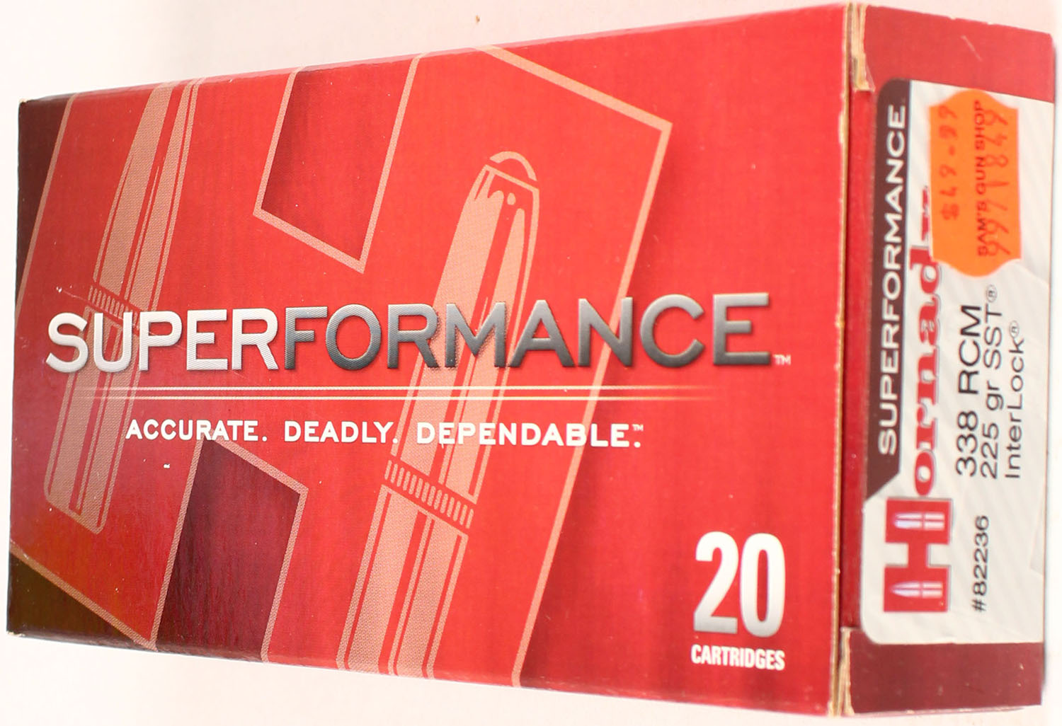 Hornady, Superformance, 338 RCM, 225 Grain SST Interlock, Full, 1pc. multi-colored box, box is solid with excellent color, Ammo is excellent. Grade: Excellent ++ - Value: 20 to 80