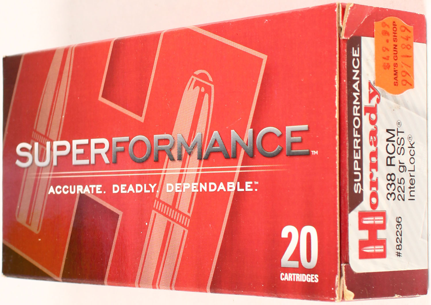 Hornady, Superformance, 338 RCM, 225 Grain SST Interlock, Full, 1pc. multi-colored box, box is solid with excellent color, Ammo is excellent. Grade: Excellent ++ - Value: 20 to 80