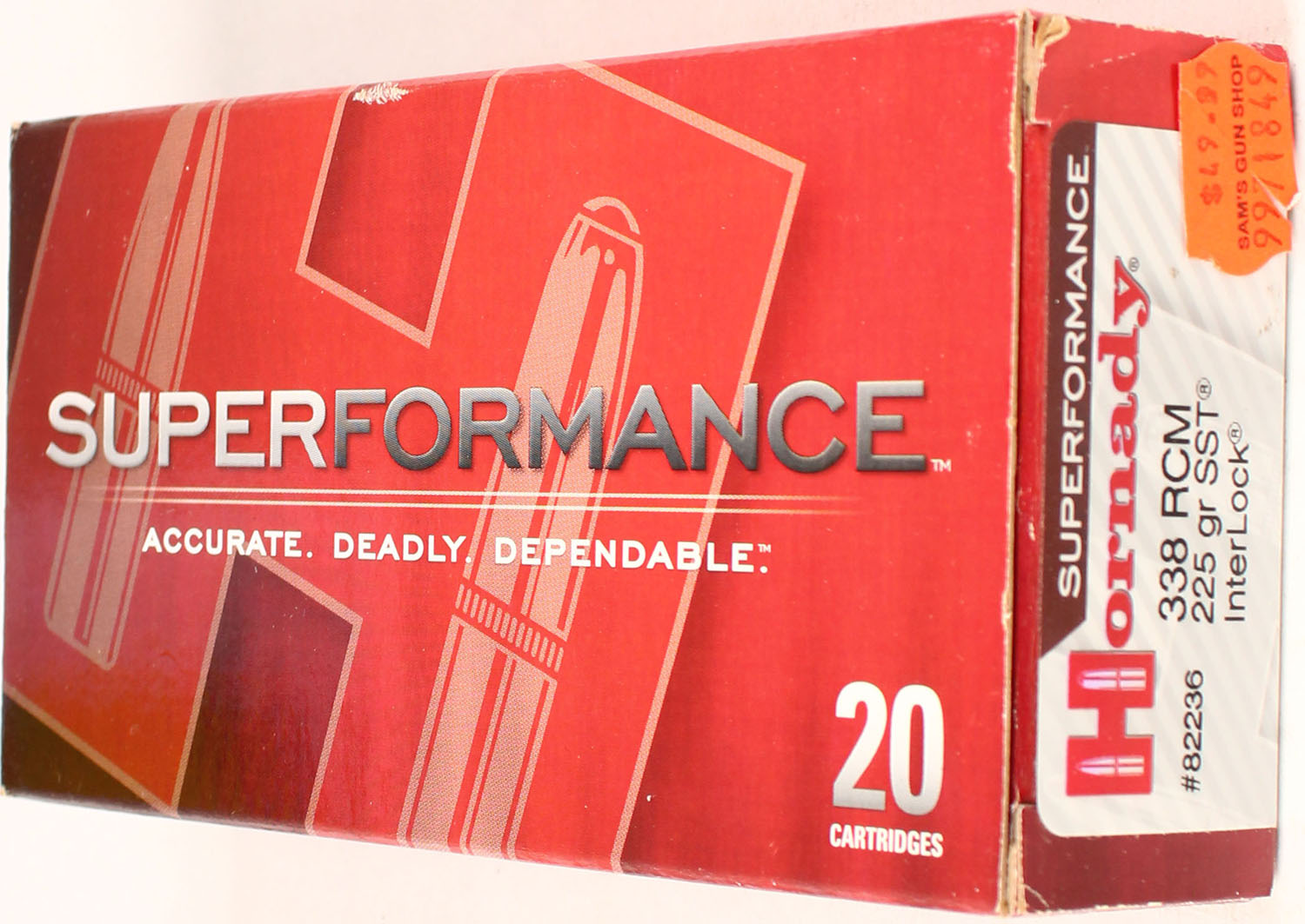 Hornady, Superformance, 338 RCM, 225 Grain SST Interlock, Full, 1pc. multi-colored box, box is solid with excellent color, Ammo is excellent. Grade: Excellent ++ - Value: 20 to 80