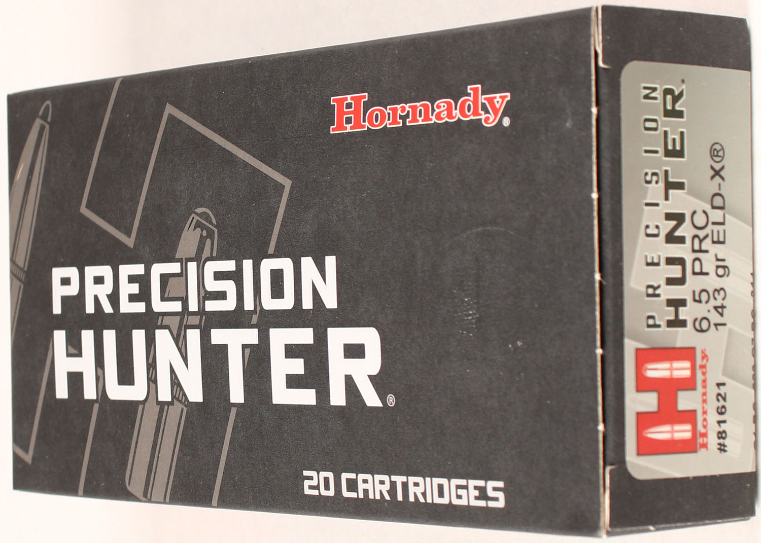 Hornady, Precision Hunter, 6.5 PRC, 143 Grain ELD-X, Full, 1pc. multi-colored box, box is solid with excellent color, Ammo is excellent. Grade: Excellent ++ - Value: 20 to 80