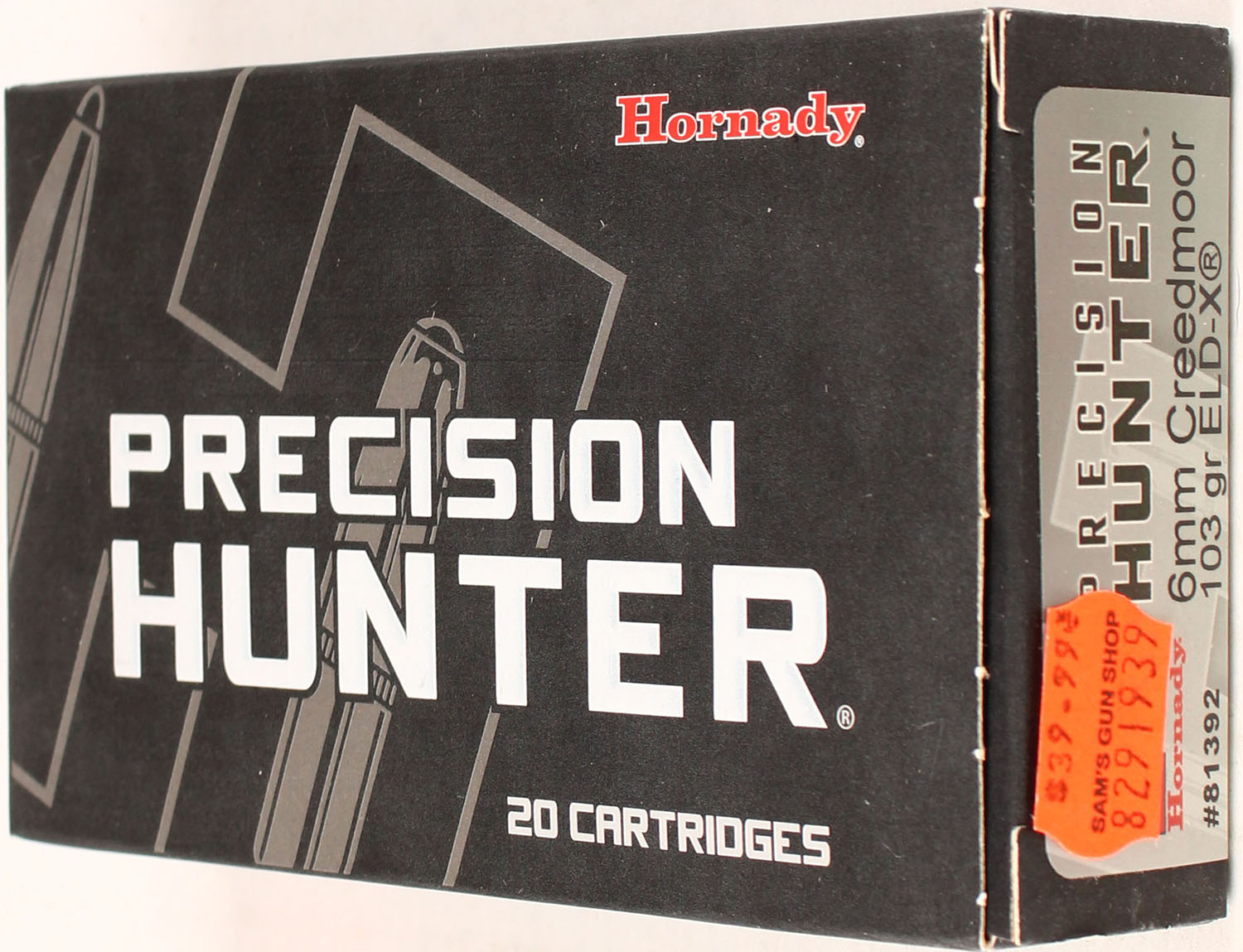 Hornady, Precision Hunter, 6mm Creedmoor, 103 Grain ELD-X, Full, 1pc. multi-colored box, box is solid with excellent color, Ammo is excellent. Grade: Excellent ++ - Value: 20 to 80