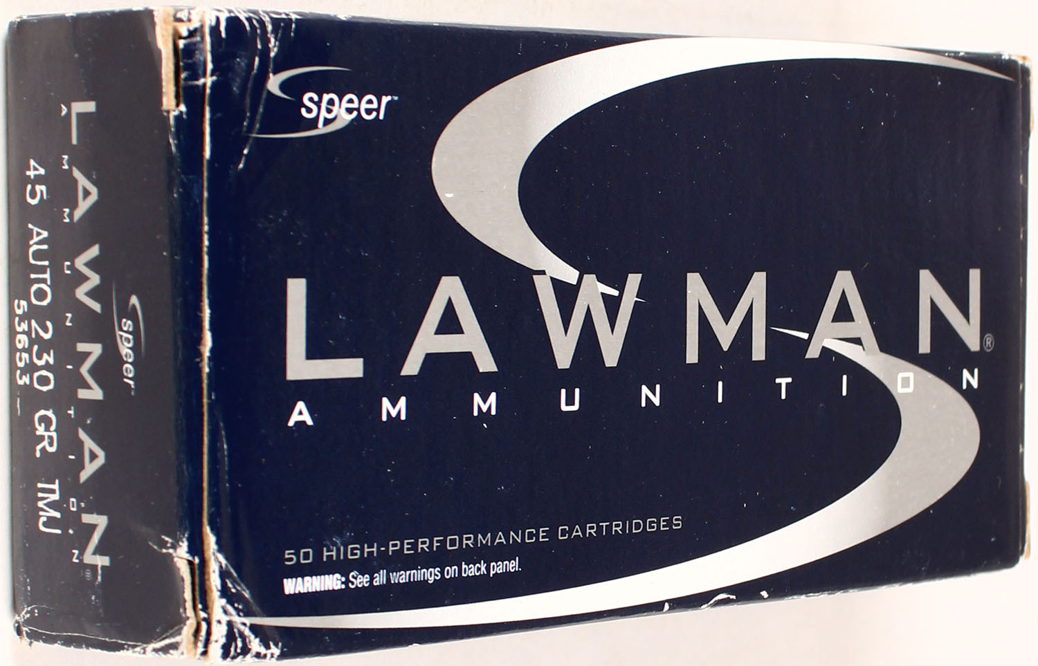 Speer, Lawman, 45 Auto, 230 Grain TMJ, Full, 1pc. multi-colored box, box is solid, with excellent color, Ammo is excellent. Grade: Excellent ++ - Value: 20 to 80