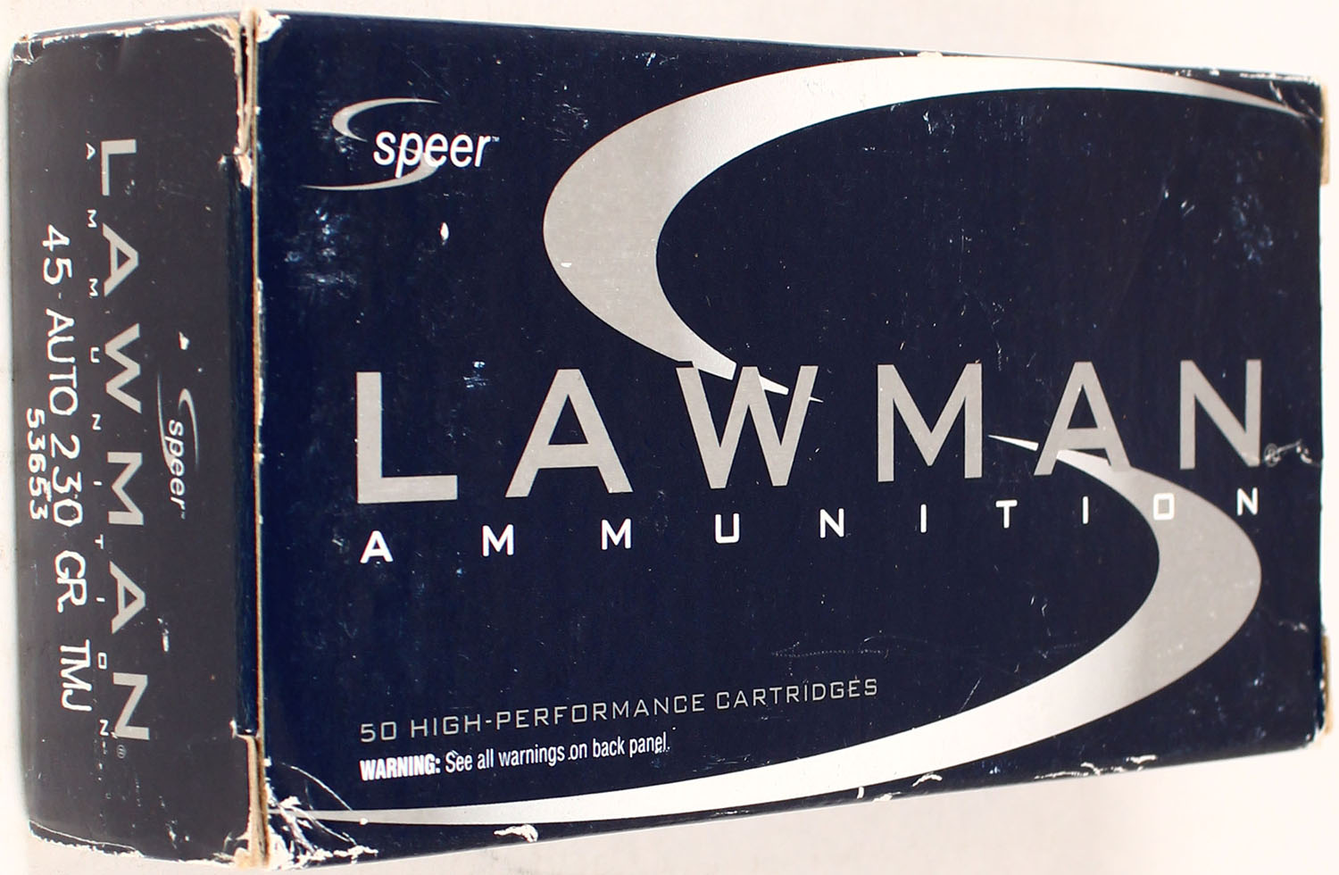 Speer, Lawman, 45 Auto, 230 Grain TMJ, Full, 1pc. multi-colored box, box is solid, with excellent color, Ammo is excellent. Grade: Excellent ++ - Value: 20 to 80