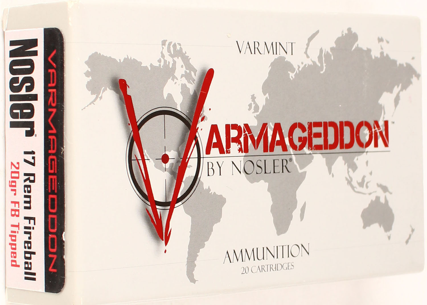 Nosler, Varmageddon, 17 Rem Fireball, 20 Grain FB Tipped, Full, 1pc. multi-colored box, box is solid, with excellent color, Ammo is excellent. Grade: Excellent ++ - Value: 20 to 80