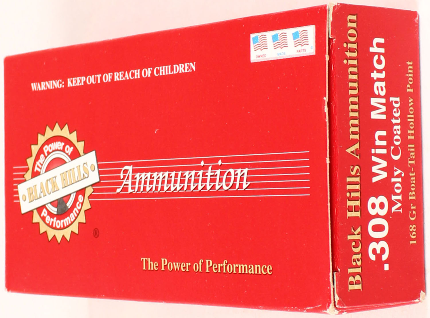 Black Hills Ammunition, 308 Win Match, 168 Grain Boat-Tail Hollow Point, Full, 1pc. multi-colored box, box is solid, with excellent color, Ammo is excellent. Grade: Excellent ++ - Value: 20 to 80