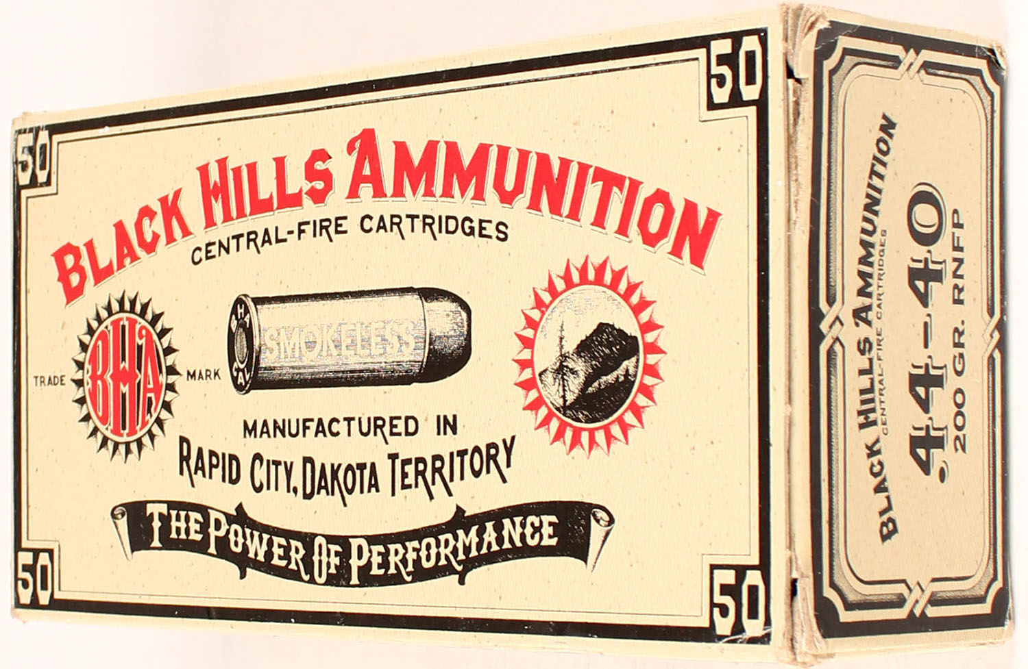 Black Hills Ammunition, 44-40, 200 Grain RNFP, Full, 1pc. multi-colored box, box is solid, with excellent color, Ammo is excellent. Grade: Excellent ++ - Value: 20 to 80