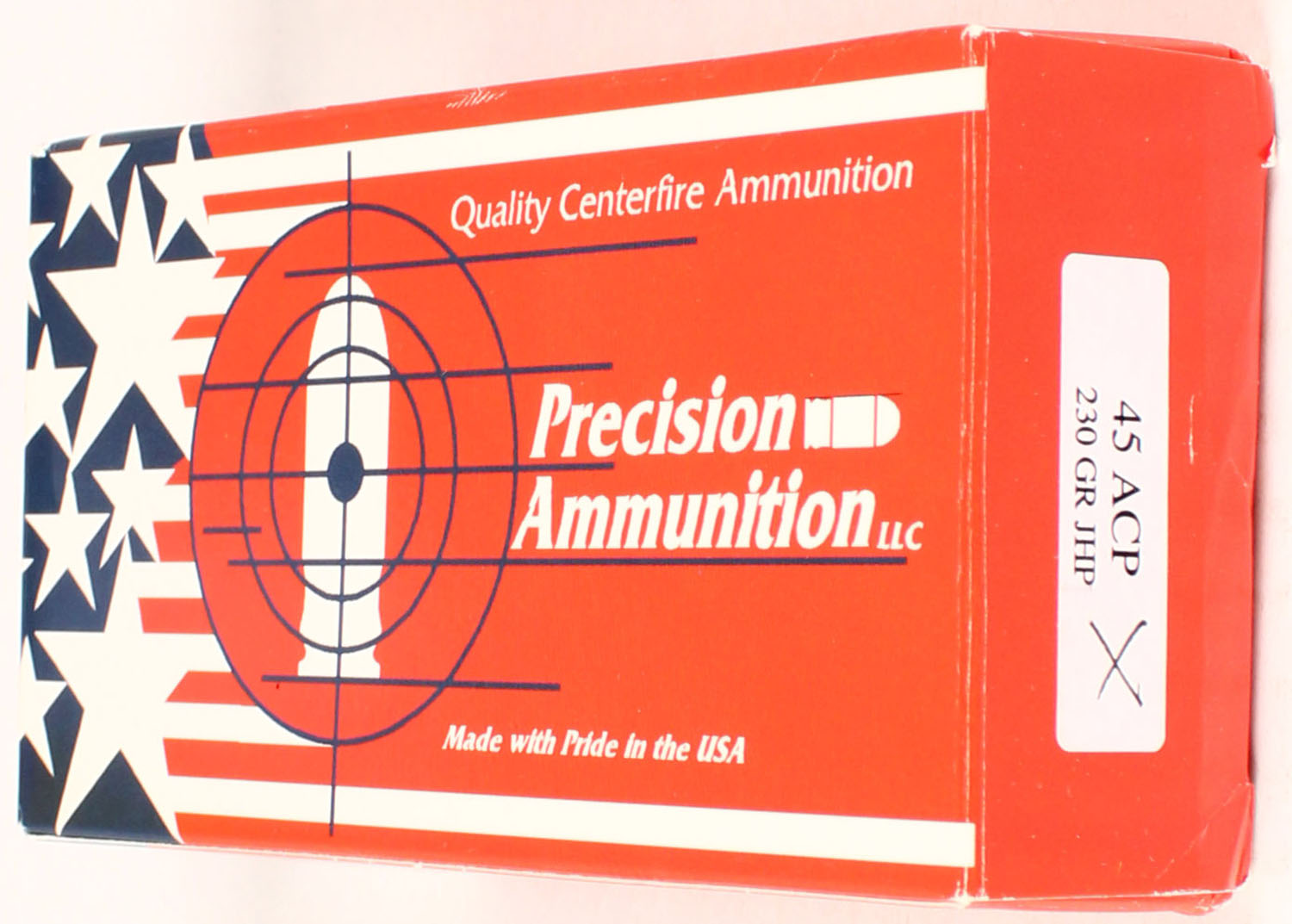Precision Ammunition, 45 ACP, 230 Grain JHP, Full, 1pc. multi-colored box, box is solid, with excellent color, Ammo is excellent. Grade: Excellent ++ - Value: 20 to 80