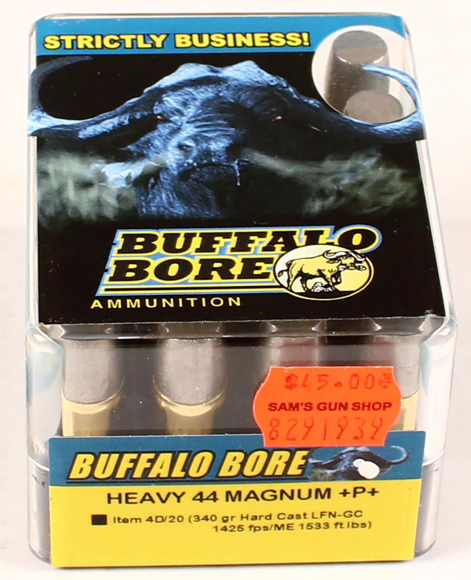 Buffalo Bore, Heavy 44 Mag !W%W!, 340 Grain LFN-GC, FULL & SEALED, 1pc. multi-colored box, box is solid, with excellent color. Grade: Excellent ++ - Value: 20 to 80