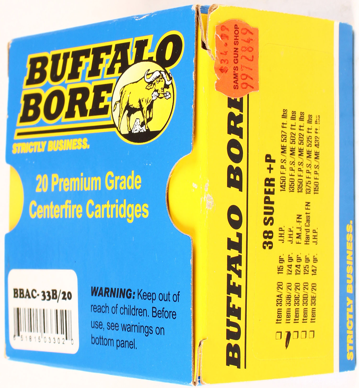 Buffalo Bore, 38 Super +P, 124 Grain JHP, Full, 1pc. multi-colored box, box is solid, with excellent color, Ammo is excellent. Grade: Excellent ++ - Value: 20 to 80