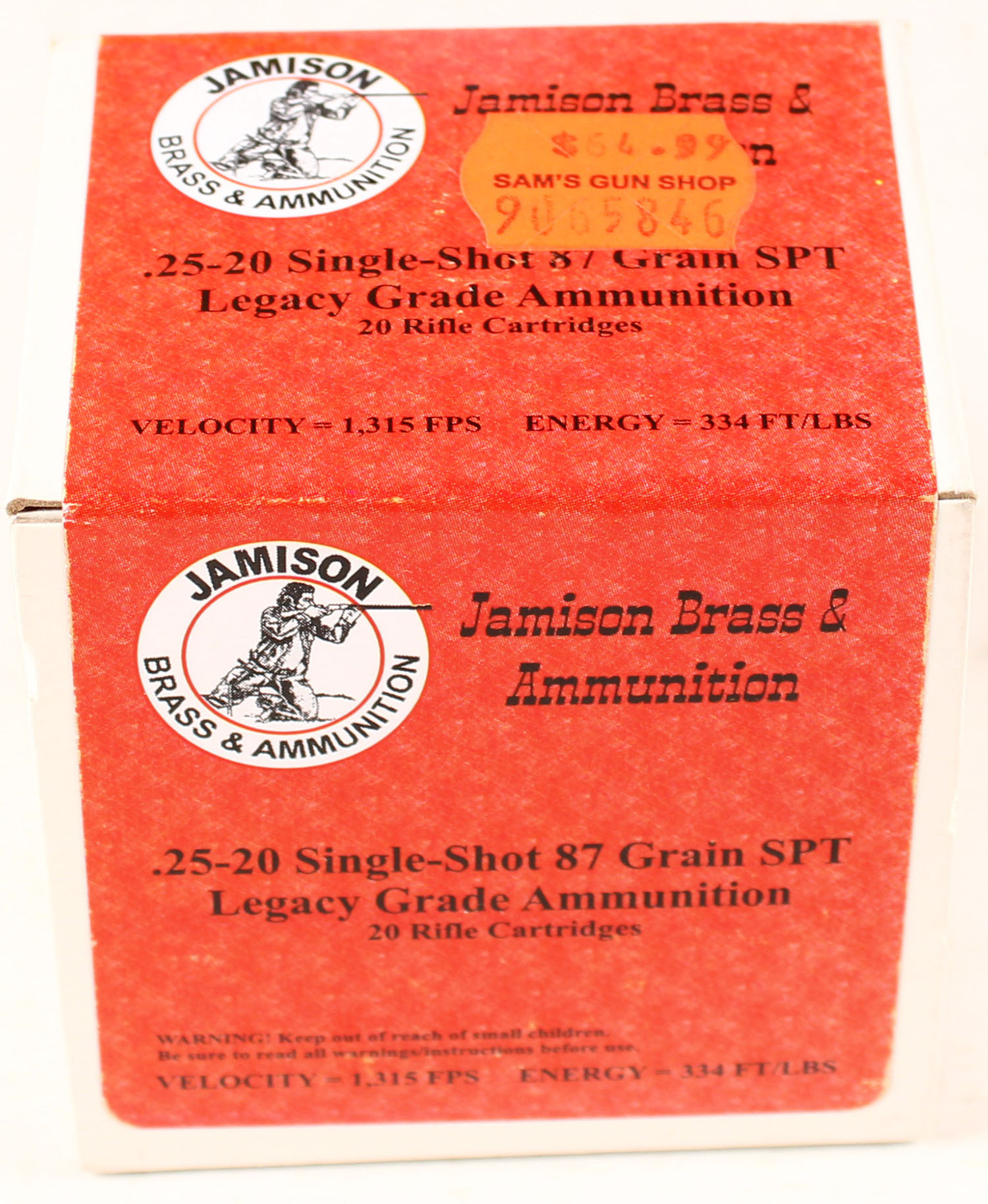 Jamison Brass & Ammunition, 25-20 Single Shot, 87 Grain SPT Legacy Grade, Full, 1pc. multi-colored box, box is solid, with excellent color, Ammo is excellent. Grade: Excellent ++ - Value: 20 to 80
