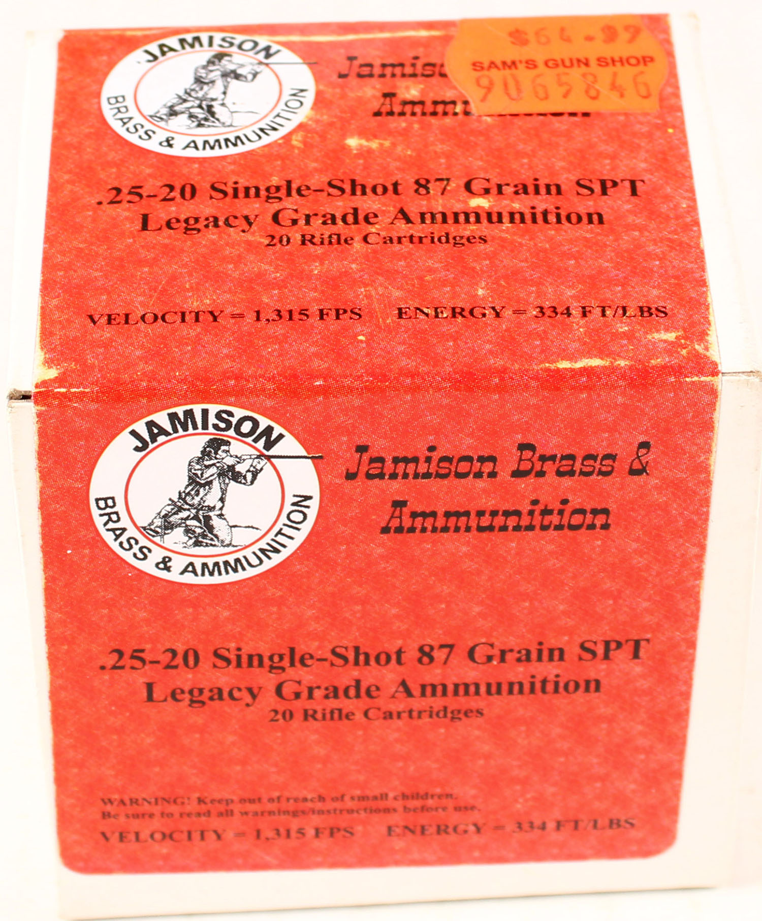 Jamison Brass & Ammunition, 25-20 Single Shot, 87 Grain SPT Legacy Grade, Full, 1pc. multi-colored box, box is solid, with excellent color, Ammo is excellent. Grade: Excellent ++ - Value: 20 to 80