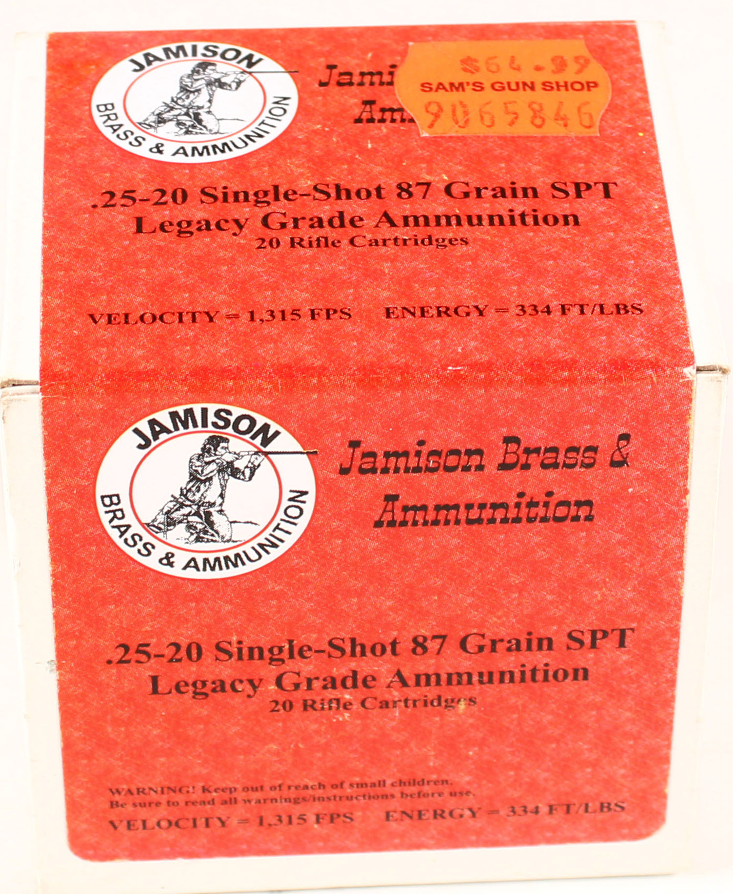 Jamison Brass & Ammunition, 25-20 Single Shot, 87 Grain SPT Legacy Grade, Full, 1pc. multi-colored box, box is solid, with excellent color, Ammo is excellent. Grade: Excellent ++ - Value: 20 to 80