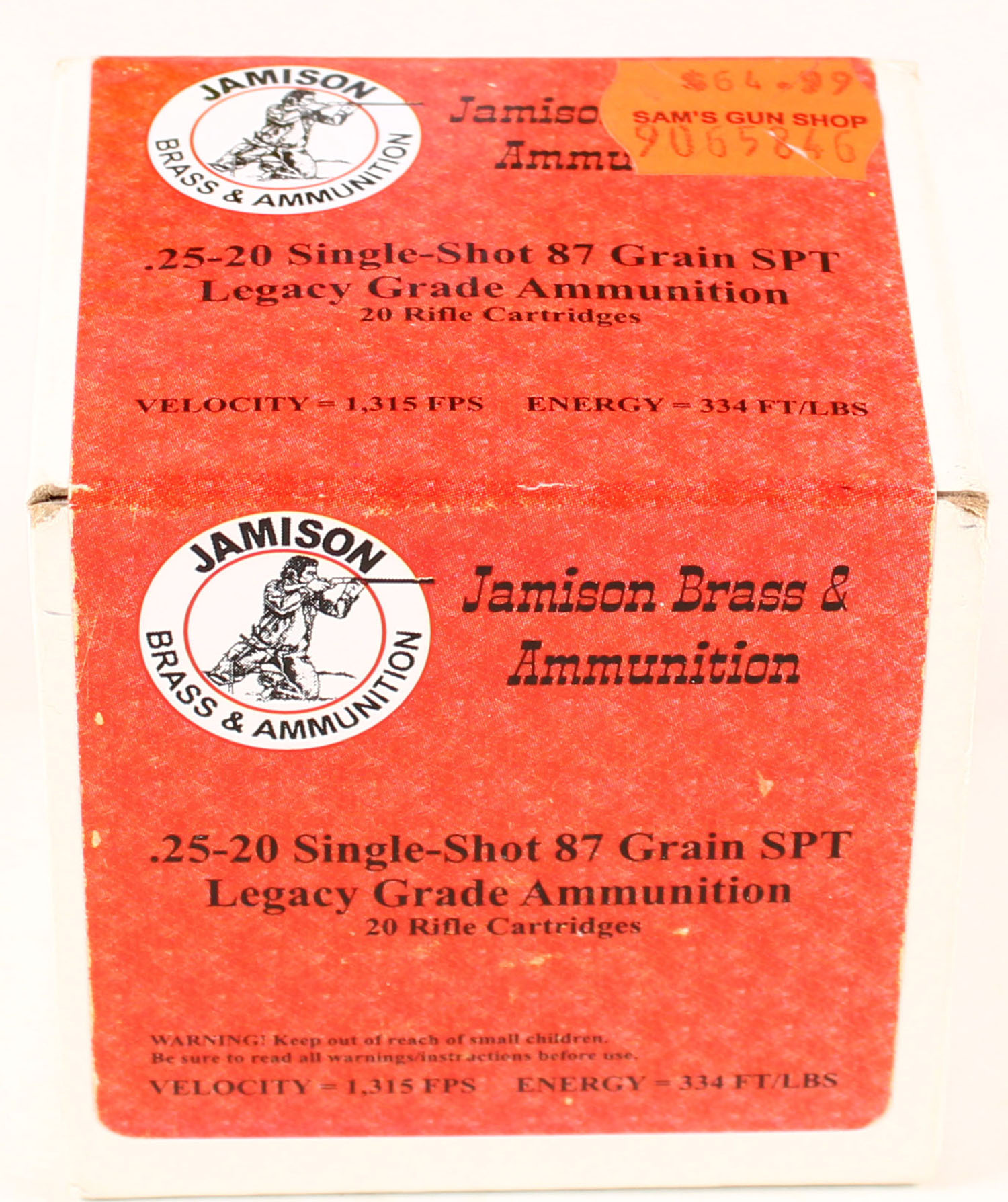 Jamison Brass & Ammunition, 25-20 Single Shot, 87 Grain SPT Legacy Grade, Full, 1pc. multi-colored box, box is solid, with excellent color, Ammo is excellent. Grade: Excellent ++ - Value: 20 to 80