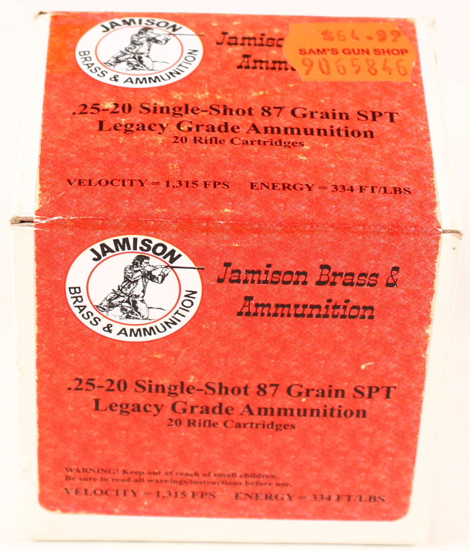 Jamison Brass & Ammunition, 25-20 Single Shot, 87 Grain SPT Legacy Grade, Full, 1pc. multi-colored box, box is solid, with excellent color, Ammo is excellent. Grade: Excellent ++ - Value: 20 to 80