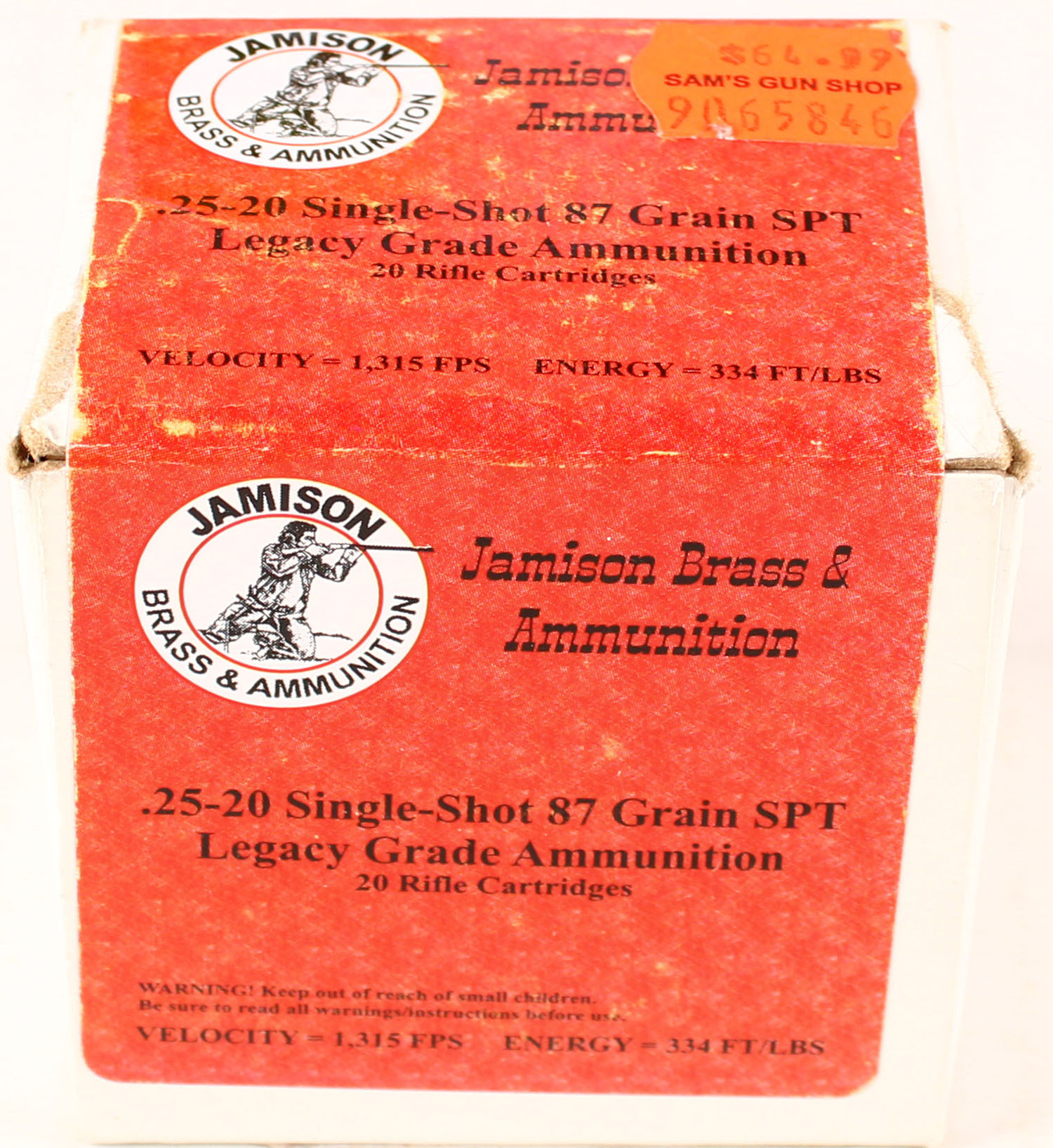 Jamison Brass & Ammunition, 25-20 Single Shot, 87 Grain SPT Legacy Grade, Full, 1pc. multi-colored box, box is solid but has shelf wear and tears, with excellent color, Ammo is excellent. Grade: Excellent ++ - Value: 20 to 80