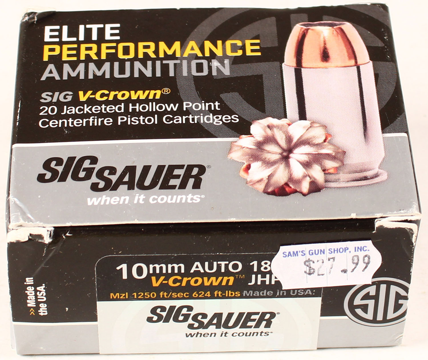 Sig Sauer, Elite Performance, 10mm Auto, 180 Grain JHP, Full, 1pc. multi-colored box, box is solid, with excellent color, Ammo is excellent. Grade: Excellent ++ - Value: 20 to 80