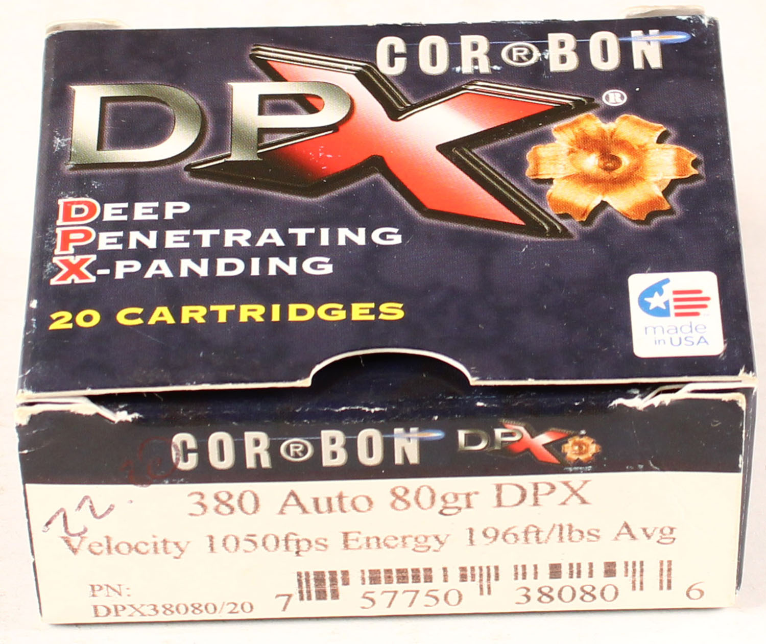 Corbon, DPX, 380 Auto, 80 Grain DPX, Partial 19rds, 1pc. multi-colored box, box is solid, has excellent color, Ammo is excellent. Grade: Excellent ++ - Value: 20 to 80