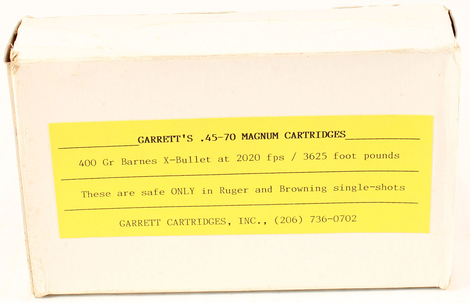 Garrett's Cartridges Inc, 45-70 Magnum, 400 Grain Barnes X-Bullet, Full, 1pc. white box with yellow label, box is solid, has excellent color, Ammo is excellent. Grade: Excellent ++ - Value: 20 to 80
