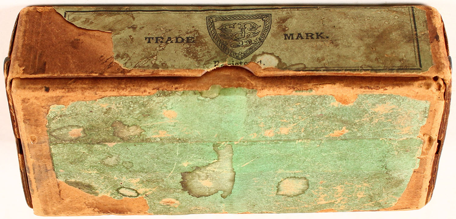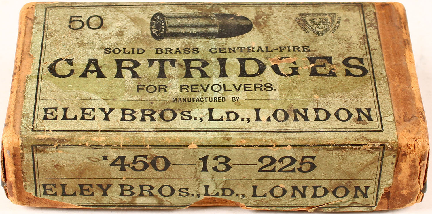 Eley Bros., .450-13-225, Partial 24rds. 2pc. Buff box with green label, box is solid with good to very good color, age soiling, some shelf wear, edge & corner wear, label is 95% intact, ammo is very good. Grade: Very Good ++ - Value: 10 to 50
