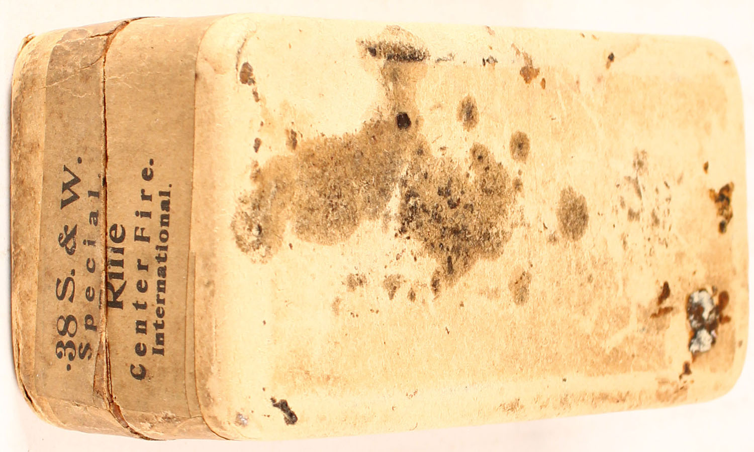 International, .38 Smith & Wesson Special, Full, 2pc. Buff box with buff top & side sealing labels, box is solid with good to very good color, age soiling, some shelf wear, edge & corner wear, labels are 99% intact, ammo is very good to excellent. Grade: Very Good - Value: 10 to 50