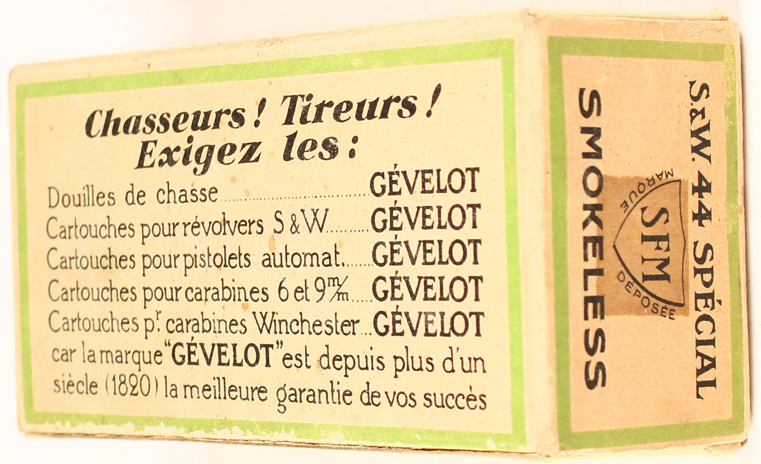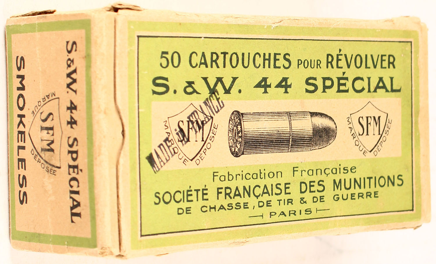 SFM, .44 Smith & Wesson Special, Revolver Cartridges, Full, 1pc. Green & white box with black ''Made in France'' Over-Stamp, box is solid with very good color, age soiling, partial seam split to top front edge, some edge & corner wear, end flaps are solid, ammo is excellent. Grade: Very Good ++ - Value: 20 to 80