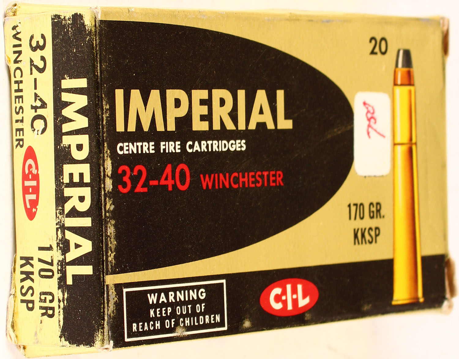 CIL, Imperial, 32-40 Winchester, 170 Grain KKSP, Full, 1pc. Multi-colored box, box is solid, has excellent color but has light shelf wear & light soiling, Ammo is excellent. Grade: Excellent - Value: 40 to 120