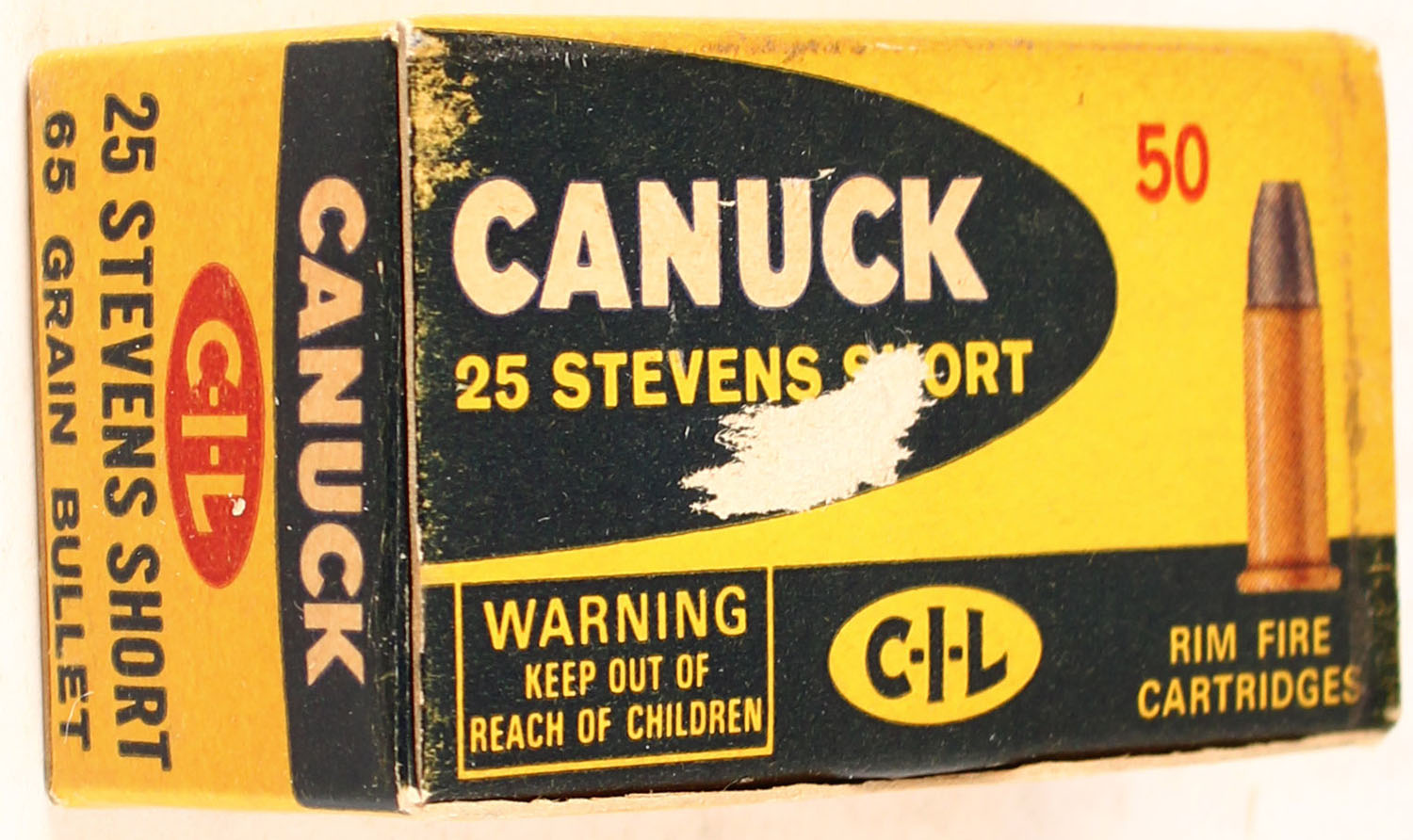 CIL, Canuck, 25 Stevens Short, 65 Grain, Full, 1pc. Multi-colored box, box is solid, has excellent color but has minor scuffs with light soiling, Ammo is excellent. Grade: Excellent + - Value: 50 to 150