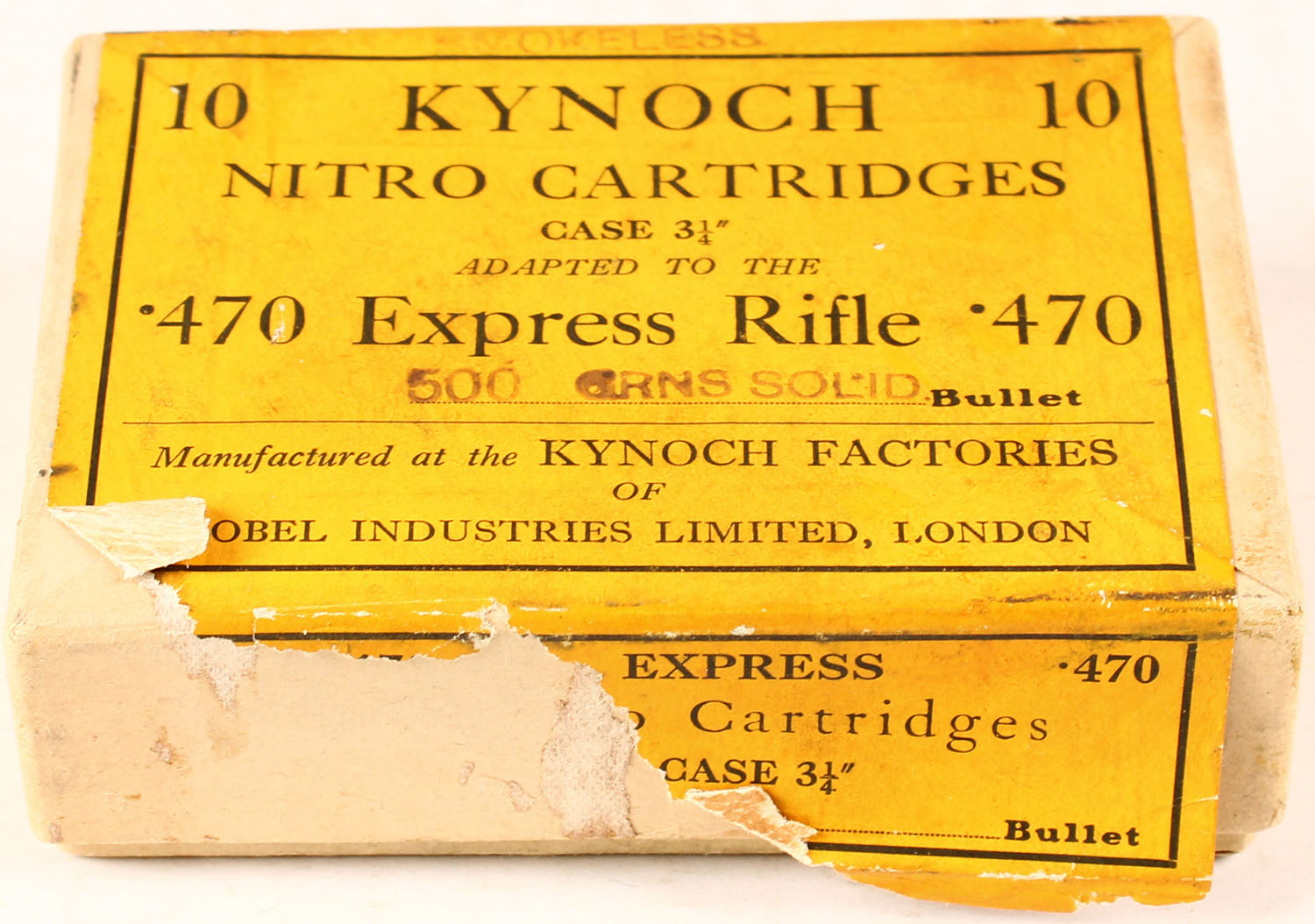 Kynoch, Nitro Cartridges, .470 Express Rifle, 500 Grns Solid Bullet, Smokeless, Full, 2pc. Buff box with yellow wraparound label, box is solid with very good to excellent color, some age soiling, very minor corner wear, edges are mostly crisp, label is 90% intact, ammo is excellent. Grade: Excellent - Value: 20 to 100