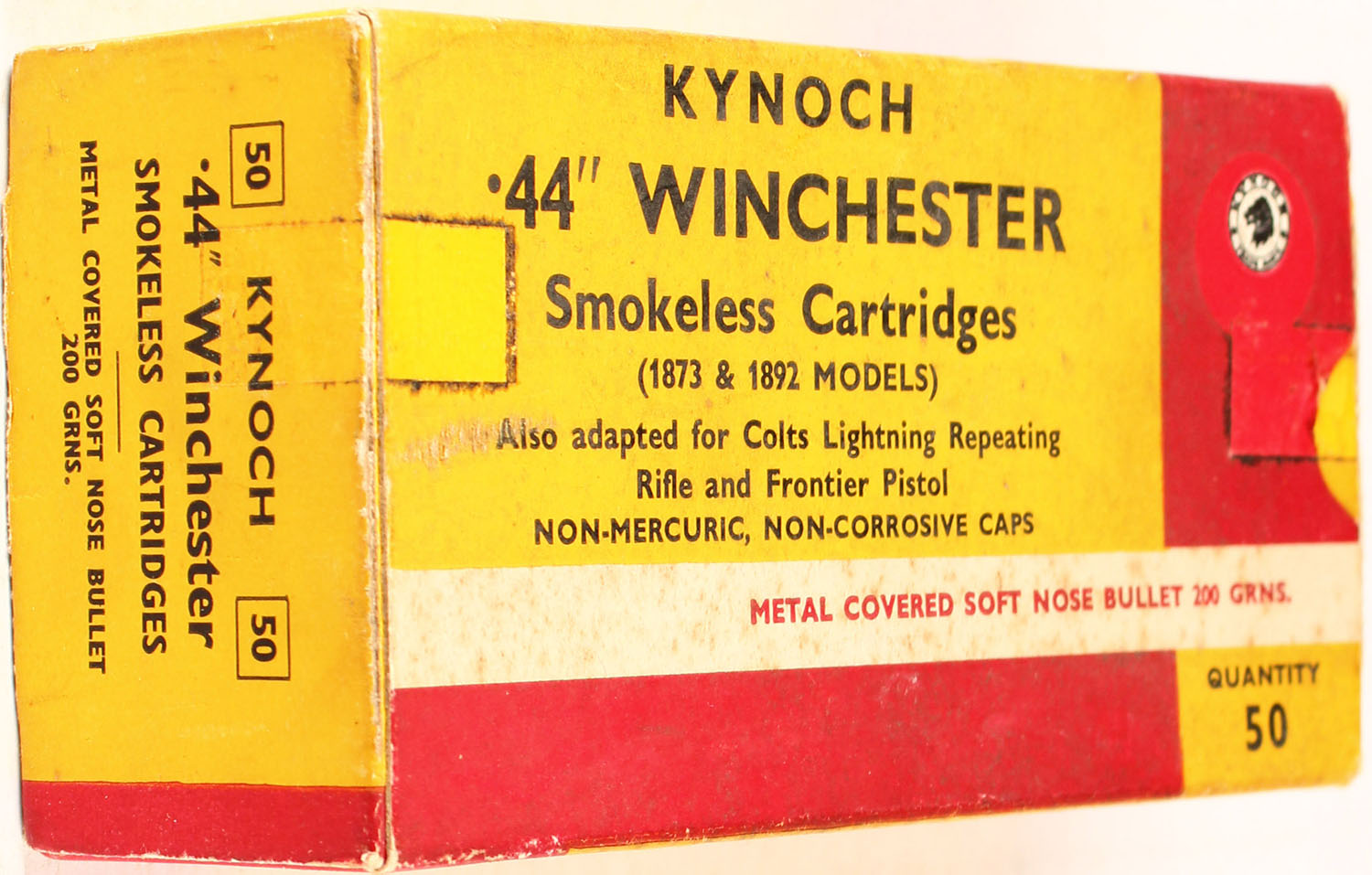 Kynoch, .44 Winchester, Smokeless Cartridges, 200 Grns. Metal Covered Soft Nose Bullet, Partial 48rds., 1pc. Yellow red & white box, box is solid with very good color, age soiling, very minor corner wear, edges are mostly crisp, end flaps are solid, ammo is excellent. Grade: Excellent - Value: 40 to 120