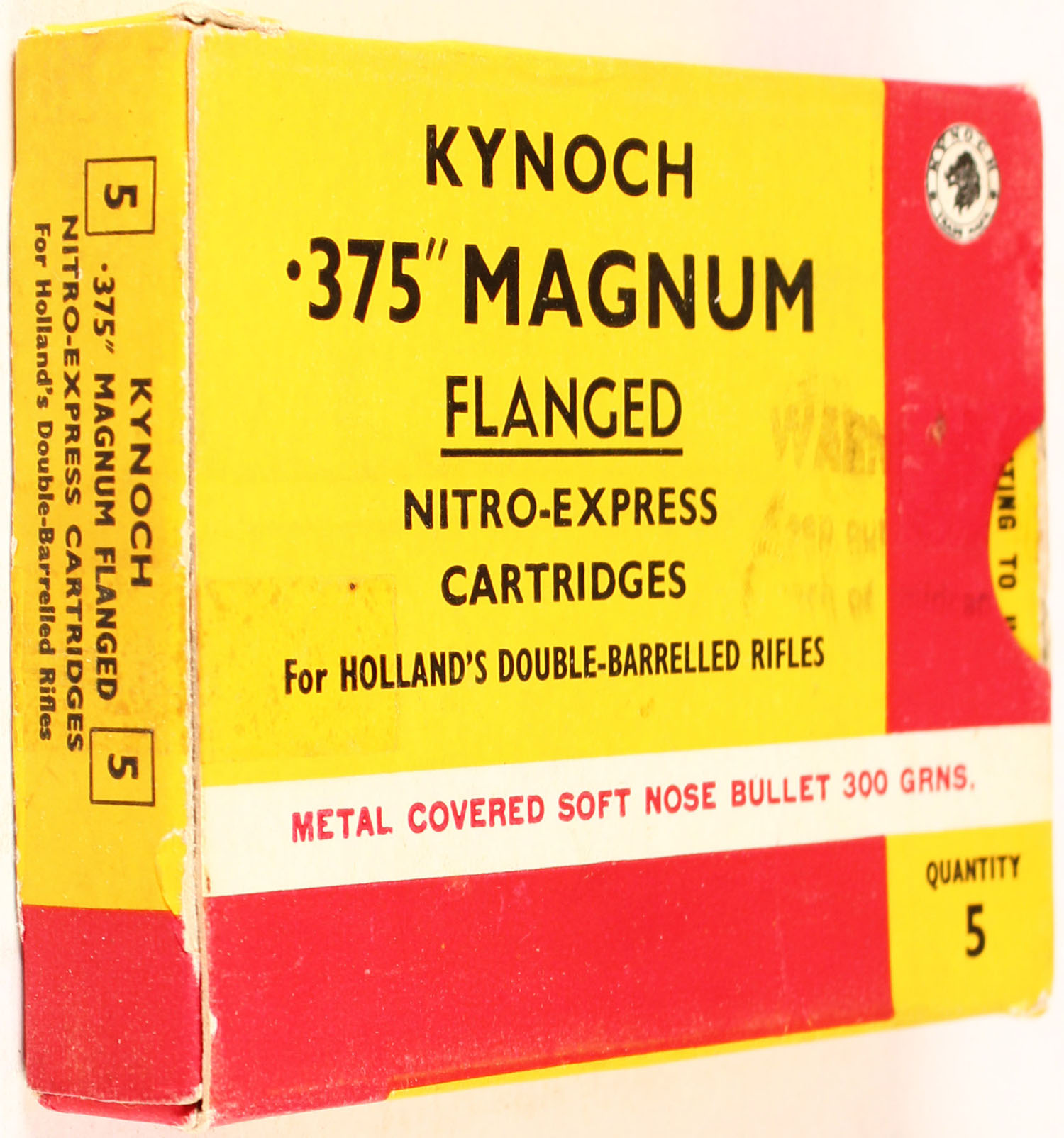 Kynoch, .375 Magnum, Flanged Nitro-Express Cartridges, 300 Grns. Metal Covered Soft Nose Bullet, Full, 1pc. Yellow red & white box with child warning stamped on top, box has excellent color, only very minor age soiling, some edge & corner wear, end flaps are solid, ammo is very good. Grade: Excellent - Value: 10 to 40