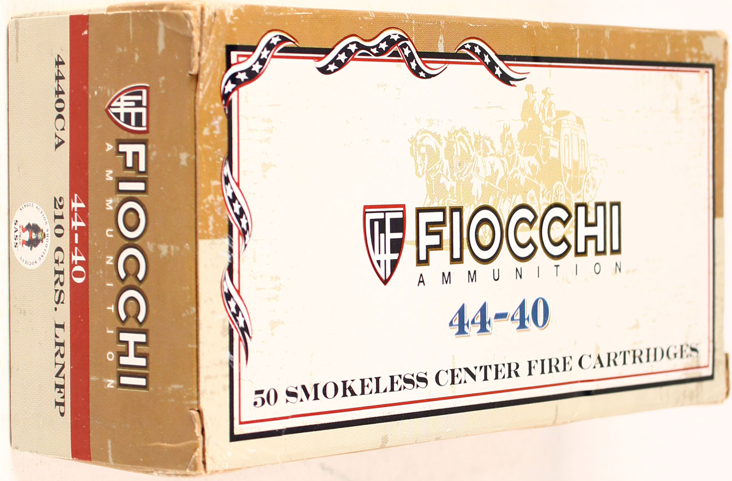 Fiocchi, 44-40, 210 Grains LRNFP, Full, 1pc. Multi-colored box, box is solid, but has light corner damage, has excellent color, Ammo is excellent. Grade: Excellent + - Value: 20 to 80