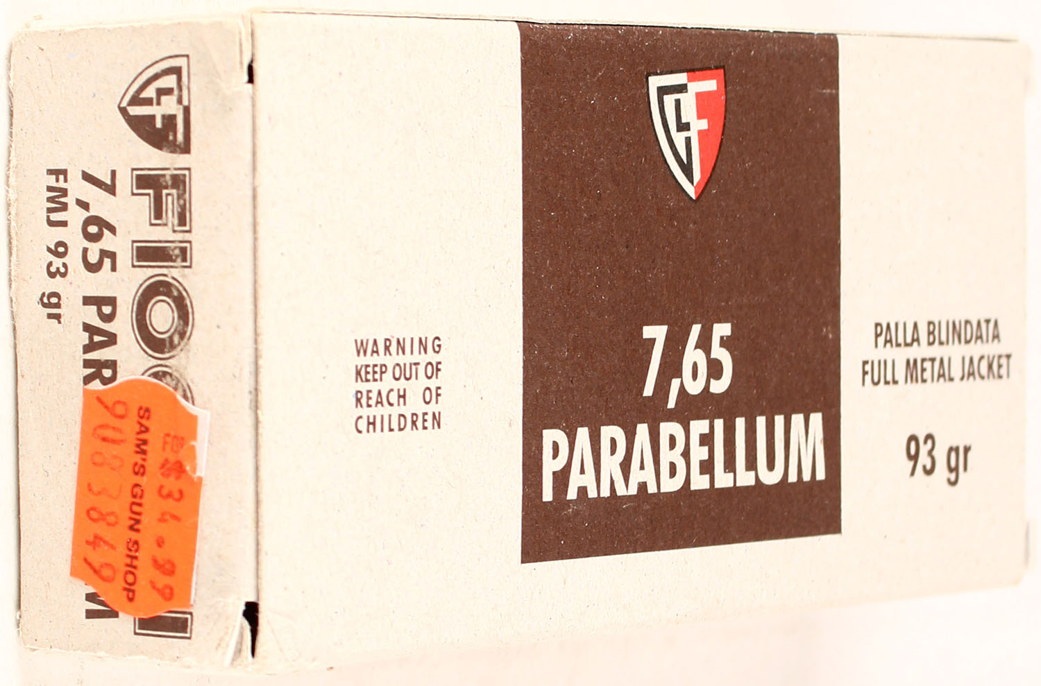 Fiocchi, 7.65 Parabellum, 93 Grain FMJ, Full, 1pc. Multi-colored box, box is solid, has excellent color, Ammo is excellent. Grade: Excellent ++ - Value: 20 to 80