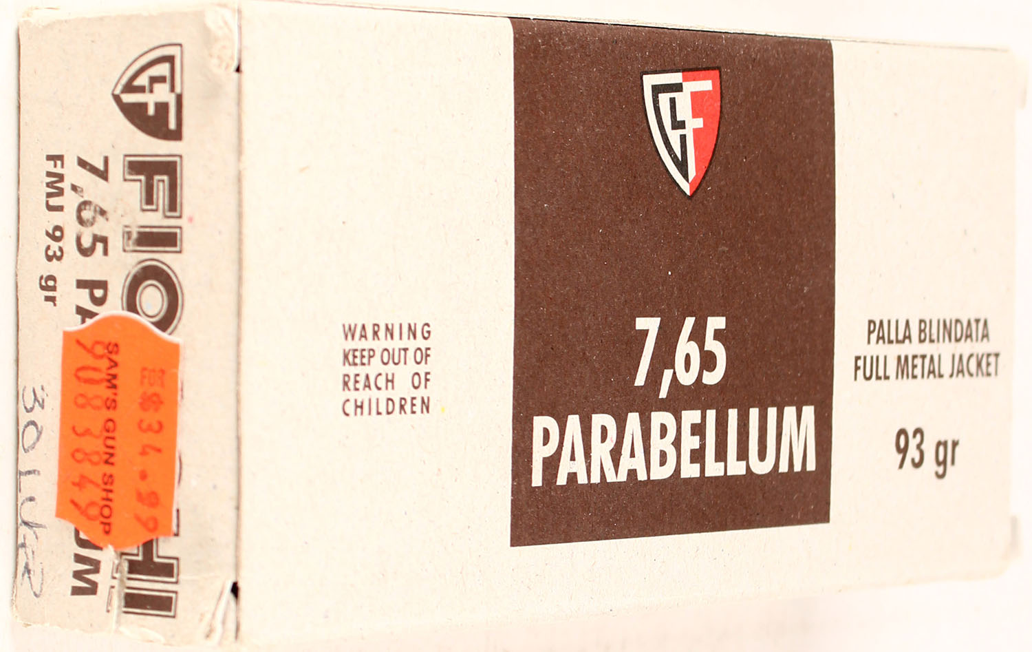 Fiocchi, 7.65 Parabellum, 93 Grain FMJ, Full, 1pc. Multi-colored box, box is solid, has excellent color, Ammo is excellent. Grade: Excellent ++ - Value: 20 to 80