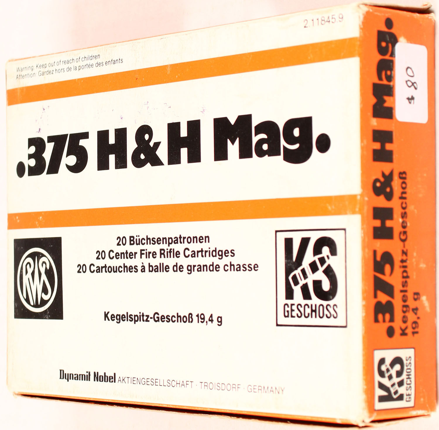 Geschoss, 375 H&H Mag, 300 Grain Cone Point, FULL & SEALED, 1pc. Multi-colored box, box is solid, has excellent color & light shelf wear. Grade: Excellent - Value: 20 to 80