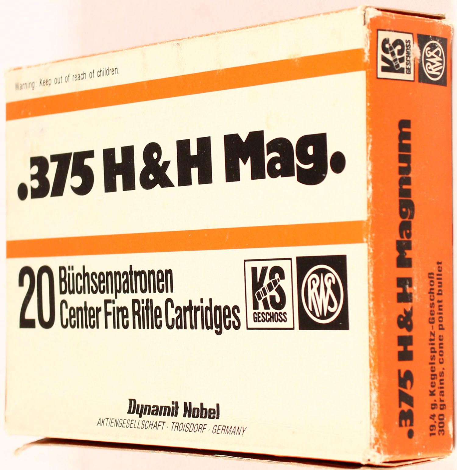 Geschoss, 375 H&H Mag, 300 Grain Cone Point, Full, 1pc. Multi-colored box, box is solid, has excellent color & small puncture on front, Ammo is excellent. Grade: Excellent + - Value: 20 to 80