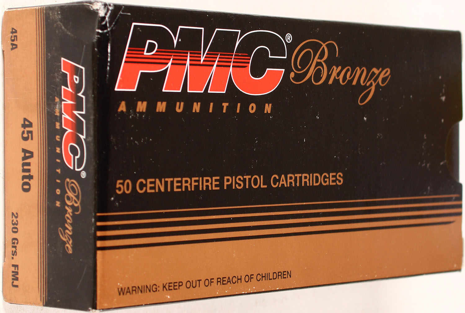 PMC, Bronze, 45 Auto, 230 Grain FMJ, Full, 1pc. Multi-colored box, box is solid, but has light shelf wear with excellent color, Ammo is excellent. Grade: Excellent + - Value: 20 to 80
