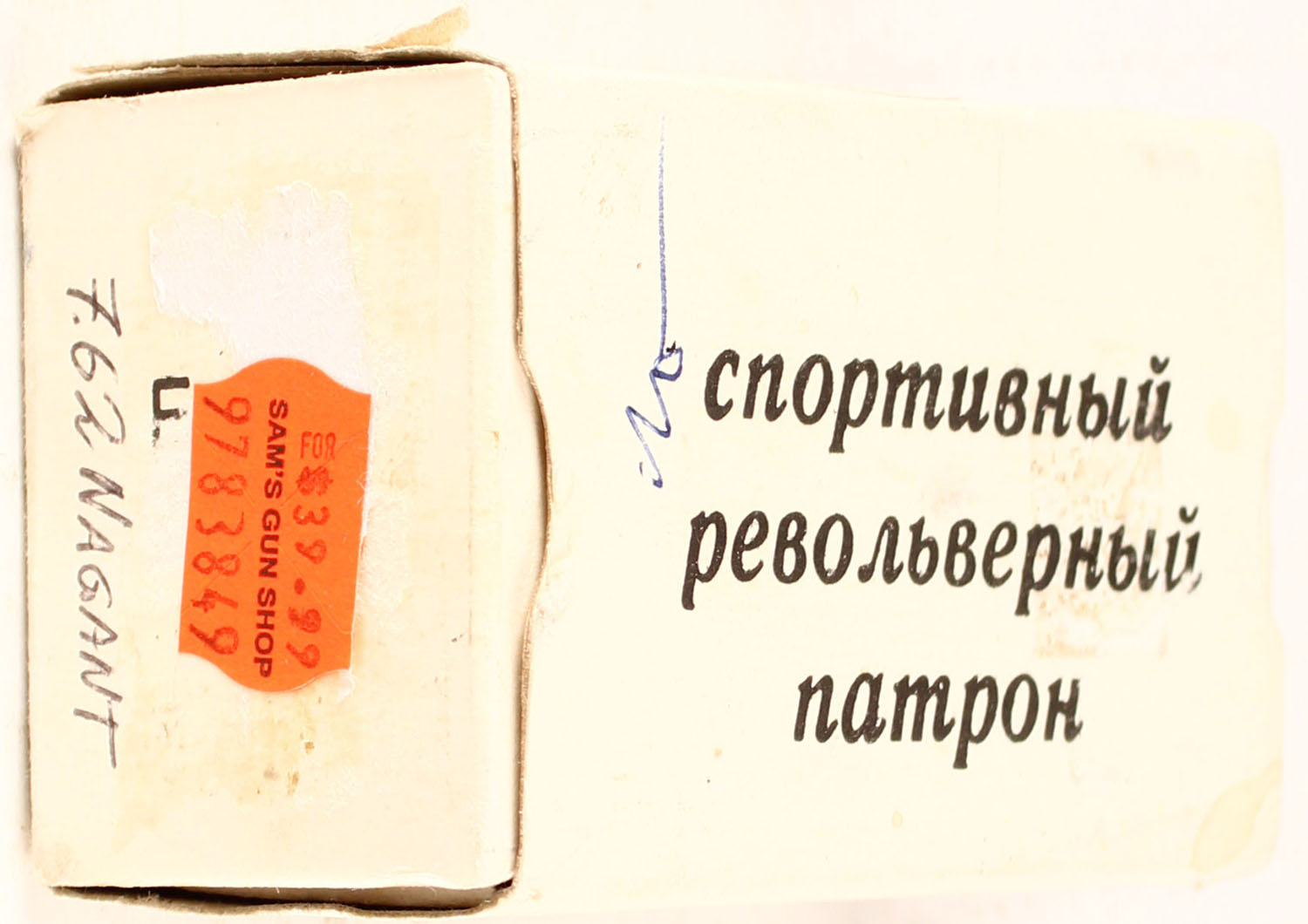 Russian Ammo, 7.62 Nagant, Unknown Grain, Full, 1pc. Black & white box, box is solid, but has light soiling with very nice color, Ammo is excellent. Grade: Excellent - Value: 20 to 80