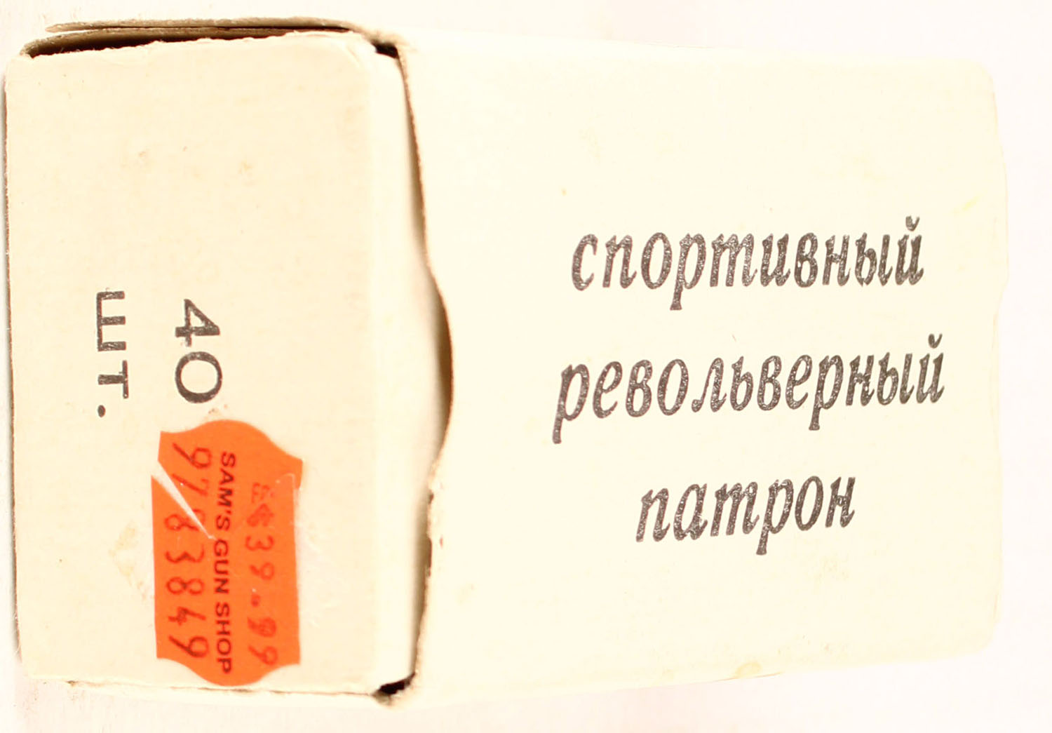 Russian Ammo, 7.62 Nagant, Unknown Grain, Full, 1pc. Black & white box, box is solid, but has light soiling with very nice color, Ammo is excellent. Grade: Excellent - Value: 20 to 80