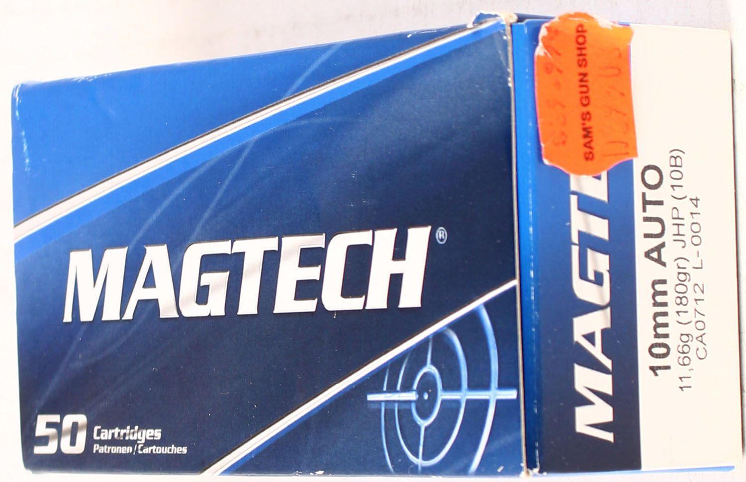 Magtech, 10mm Auto, 180 Grain JHP, Full, 1pc., Multi-colored box, box is solid with great color, Ammo is excellent. Grade: Excellent ++ - Value: 20 to 80