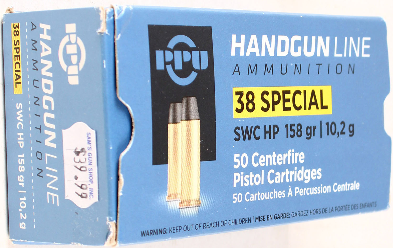 PPU, Handgun Line, 38 Special, 158 Grain SWC HP, Full, 1pc., Multi-colored box, box is solid with great color, Ammo is excellent. Grade: Excellent ++ - Value: 20 to 80