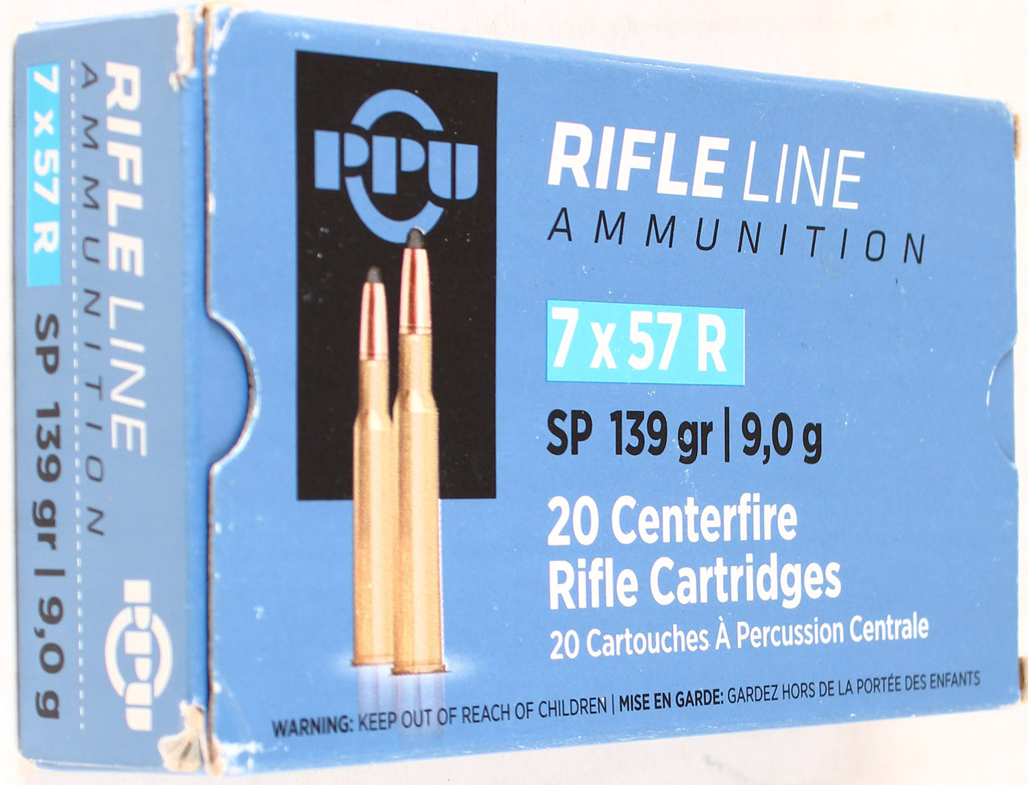 PPU, Rifle Line, 7x57R, 139 Grain SP, Full, 1pc., Multi-colored box, box is solid with great color, Ammo is excellent. Grade: Excellent ++ - Value: 20 to 80