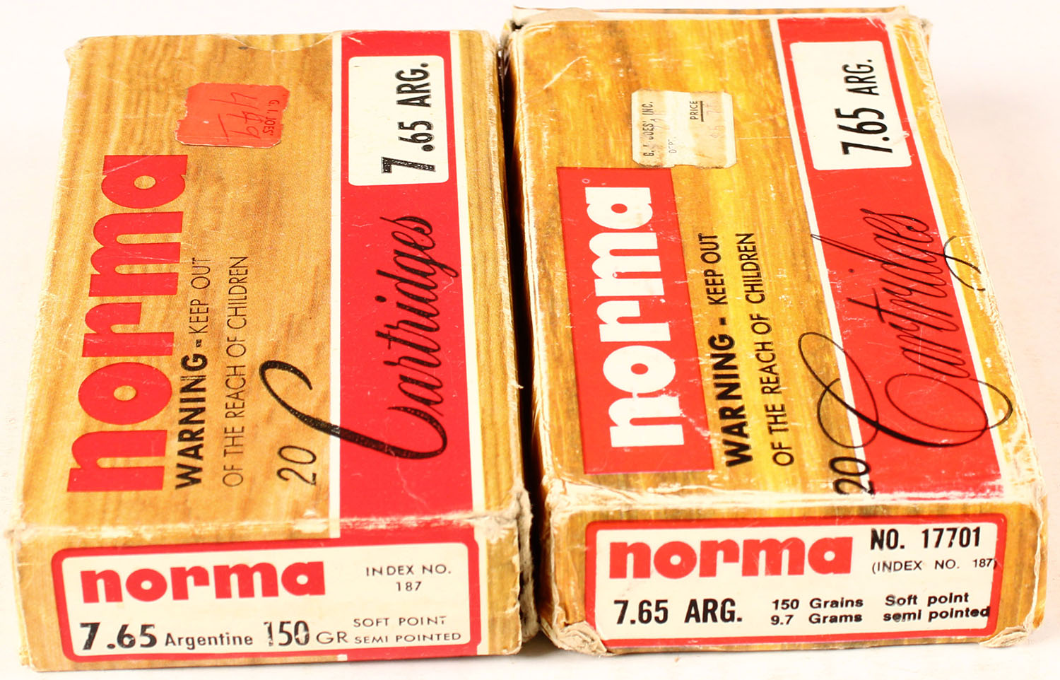 Norma, Lot of (2), 7.65 Argentine boxes, one partial one full, ammo is very good. Grade: Very Good + - Value: 30 to 90
