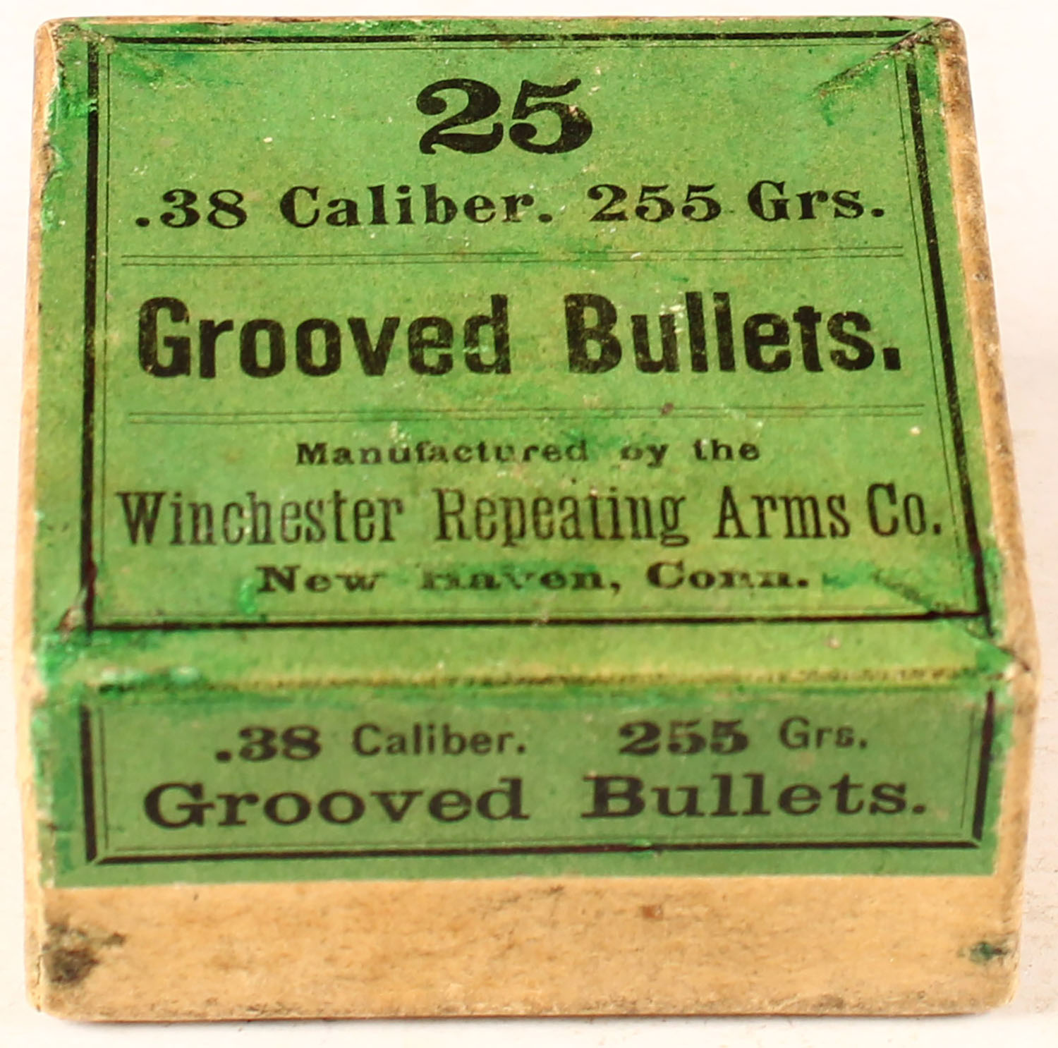 Winchester, .38 Grooved Bullets, 255 Gr., 2pc, Full, buff box with green, black & red label. Grade: Excellent - Value: 20 to 60