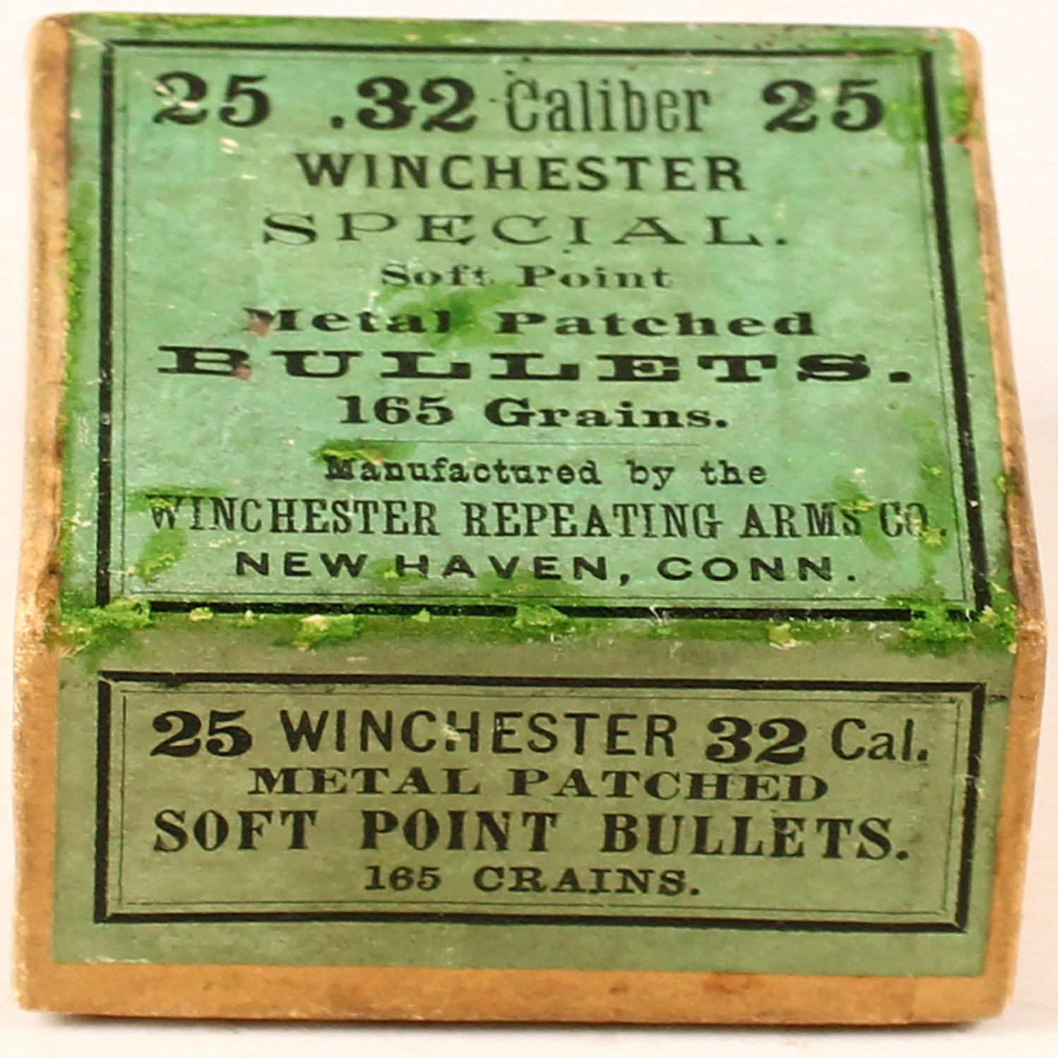 Winchester, .32 WIN Special, Soft Point Metal Patched Bullets, 165 Gr., 2pc, Full, buff box with green & black label. Grade: Excellent - Value: 20 to 60