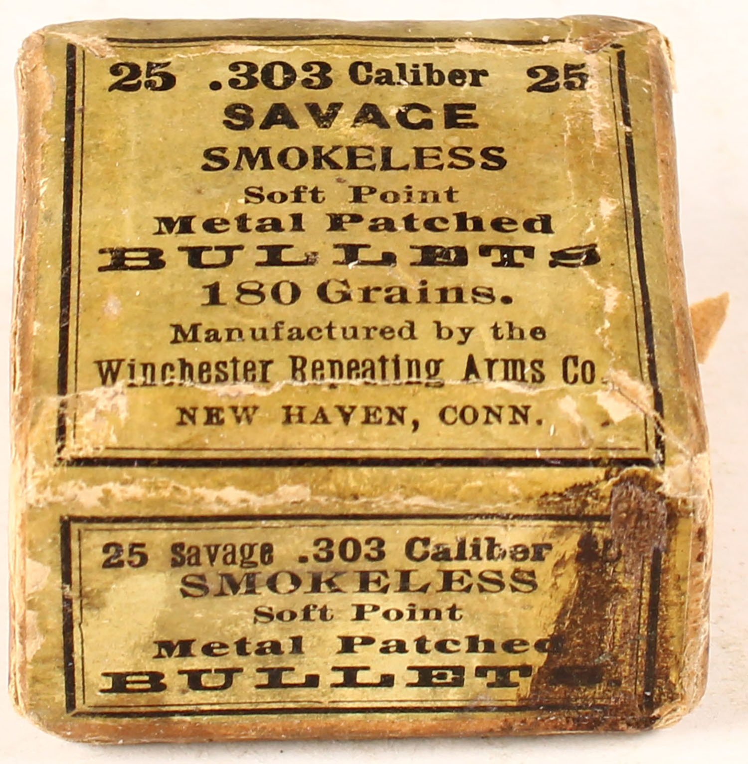 Winchester, .303 Savage Smokeless Soft Point Metal Patched Bullets, 180 Gr., 2pc, Full, buff box with green & black label. Grade: Good ++ - Value: 10 to 30